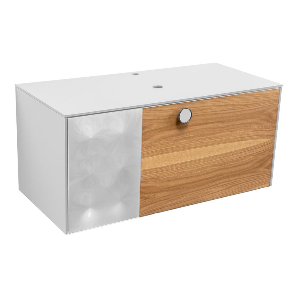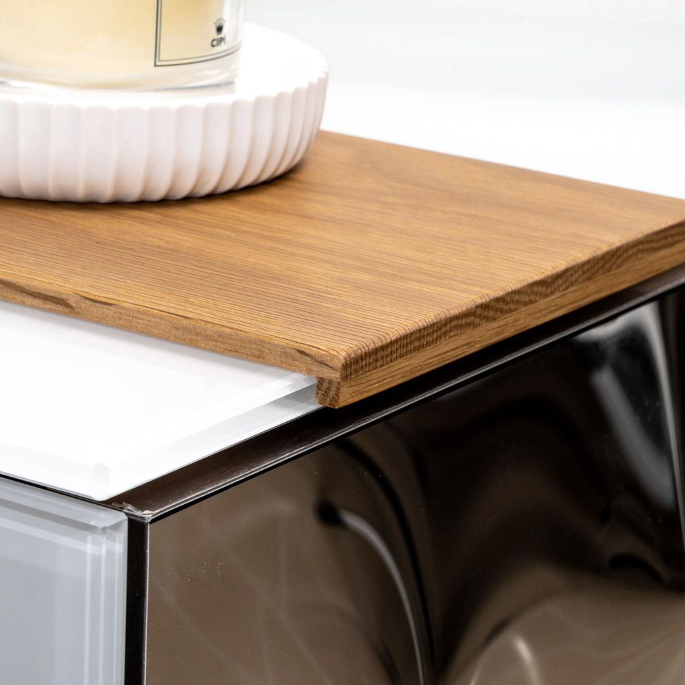 Der Mittelteil aus Naturholz mit sichtbarer Maserung verbindet sich harmonisch mit der Oberseite und den Seiten, die aus 8 mm extraklarem, gehärtetem Farbglas bestehen . Der seitliche Einsatz der Schublade besteht aus gebogenem Glas , das sich durch einen dreidimensionalen Effekt mit Lichtreflexen auszeichnet und das Design mit einem unverwechselbaren und raffinierten Detail bereichert.