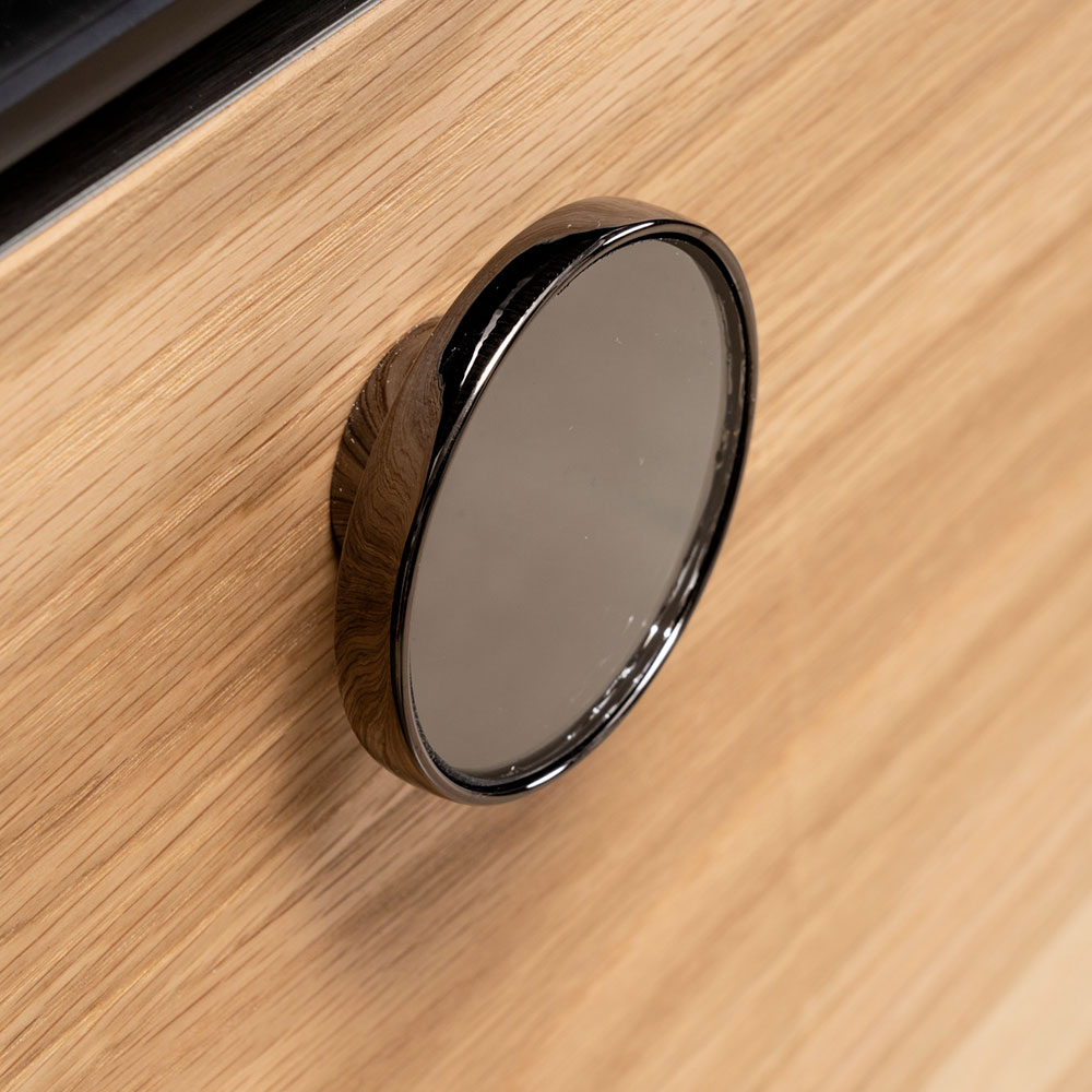 Die äußere Schublade verfügt über einen Griff aus poliertem Metall mit einem Spiegel im gleichen Finish.