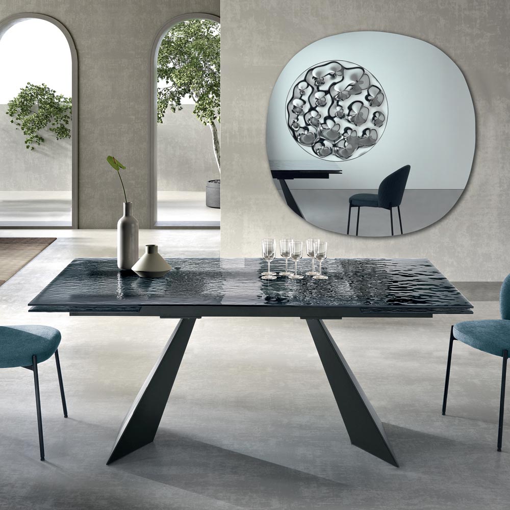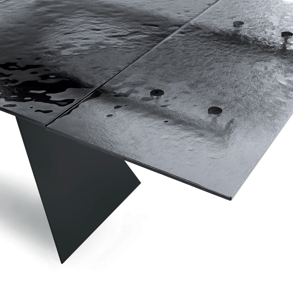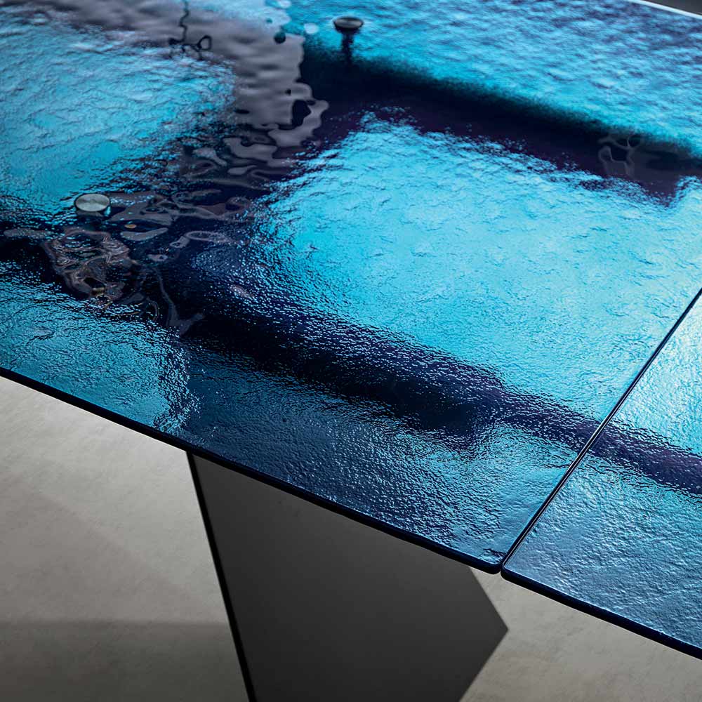 Dieser Esstisch verkörpert eine innovative Interpretation modernen Designs und vereint hochwertige Materialien mit einer skulpturalen Form, die sofort ins Auge fällt. Die Tischplatte aus gehämmertem Glas ist ein wahres Kunstwerk: Jedes Detail ihrer Oberfläche reflektiert das Licht auf einzigartige Weise und erzeugt so ein faszinierendes Spiel von Spiegelungen und Transparenzen, das dem Raum Tiefe und optische Reize verleiht.