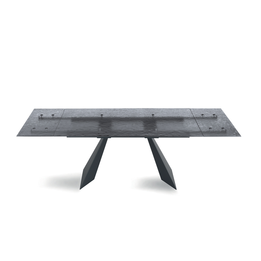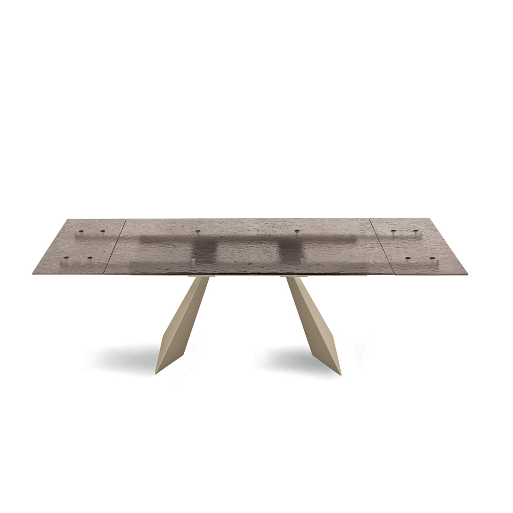 Tisch für den Innenbereich mit gehämmertem Glasteller, 2 seitlichen Verlängerungen von je 40 cm Länge und einem lackierten Metallgestell.