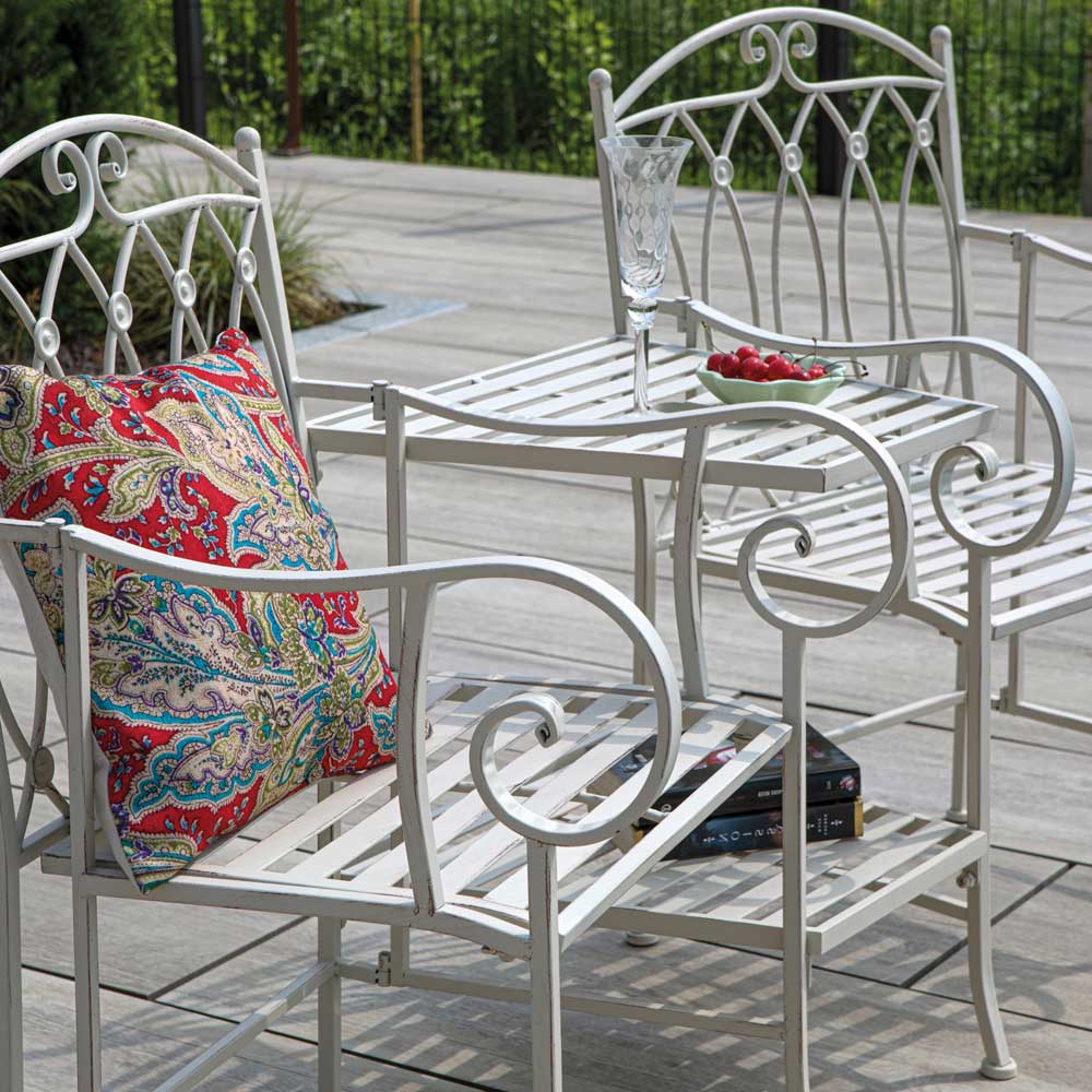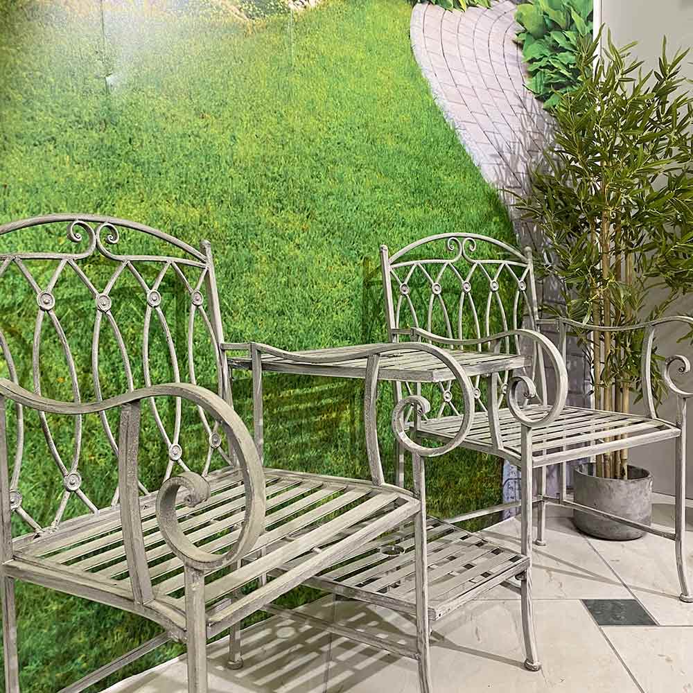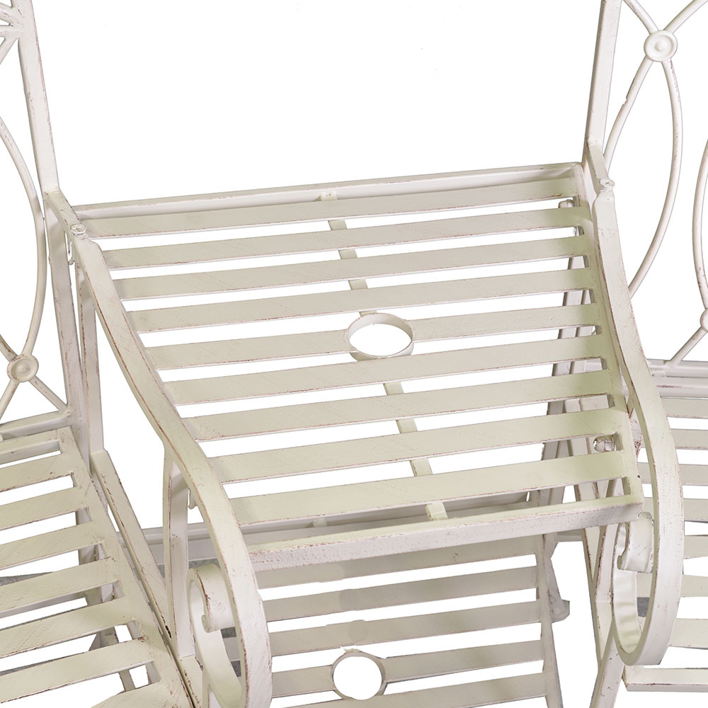 Lassen Sie sich von dem klassischen Charme und der zeitlosen Eleganz dieser Bank verzaubern, die ideal ist, um Ihren Garten oder Balkon in eine malerische Ecke der Entspannung zu verwandeln. Die komplett aus Metall gefertigte und zart lackierte Struktur besticht durch ihr ornamentales Geflecht und die eleganten, geschwungenen Details, die eine romantische und einladende Atmosphäre schaffen.