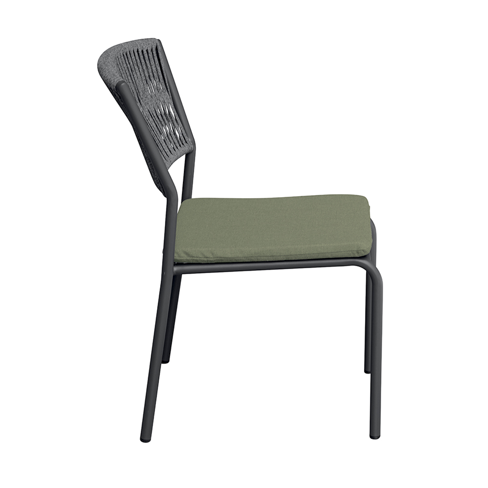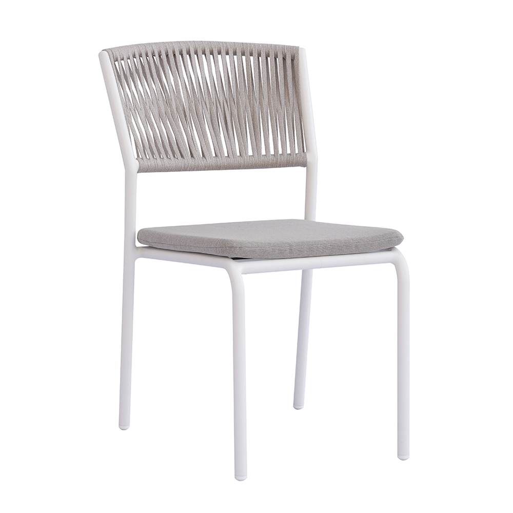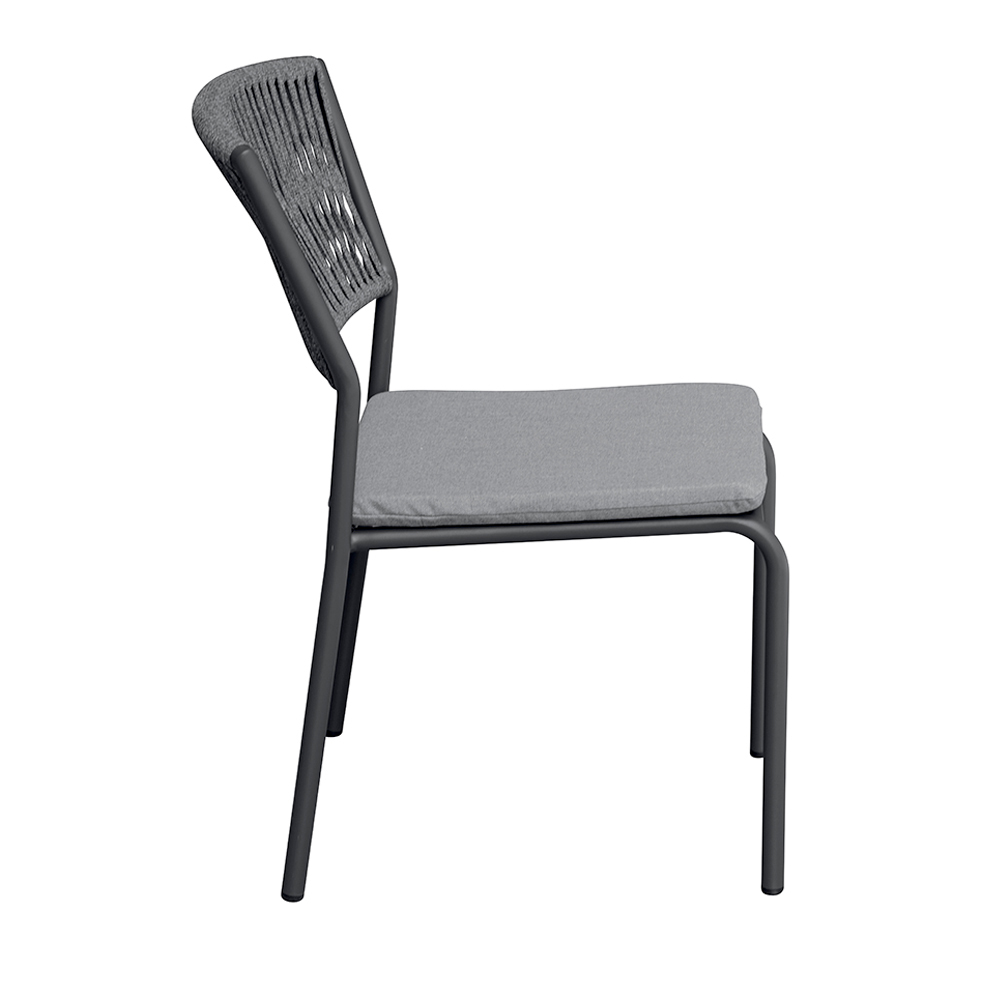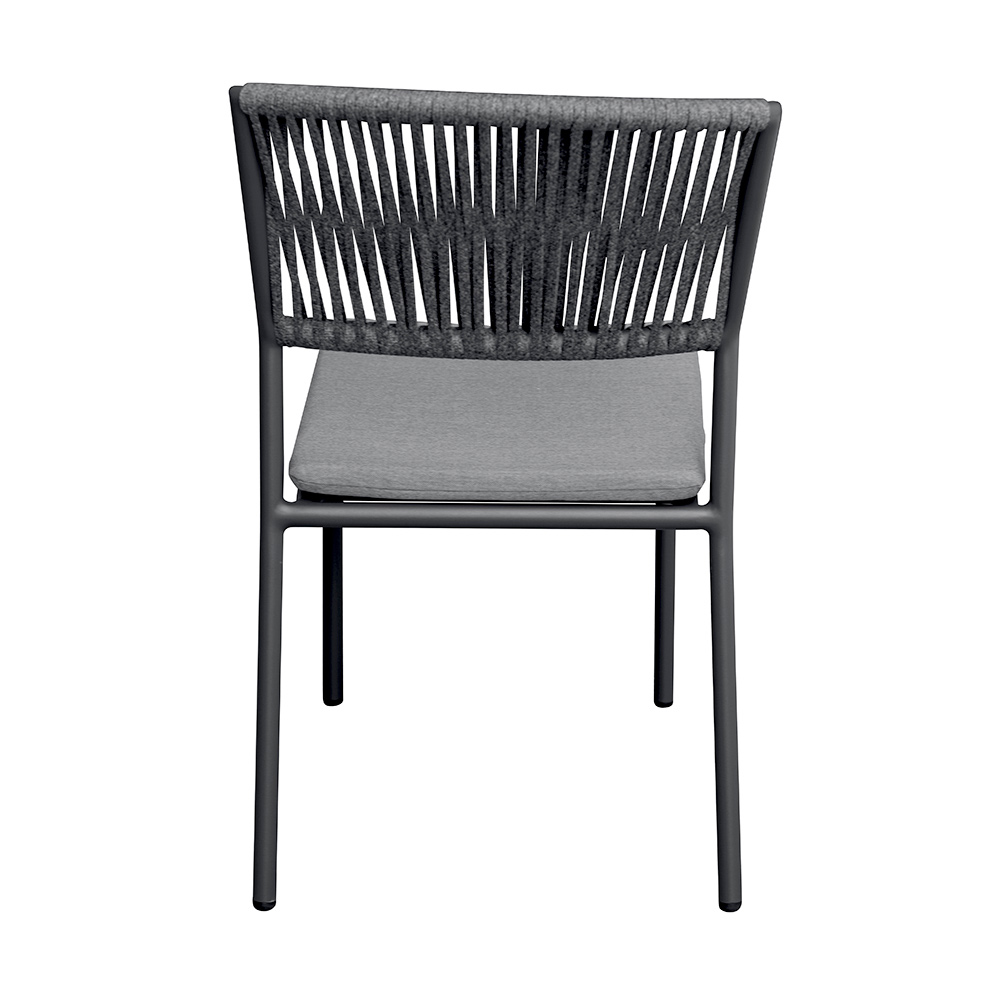 Die Rückenlehne aus Outdoor-Seil verleiht dem Ganzen eine raffinierte, moderne Note und sorgt für Komfort und Atmungsaktivität, während der Aluminiumsitz mit passendem Kissen Weichheit und Bequemlichkeit bietet und jeden Moment der Entspannung noch angenehmer macht.