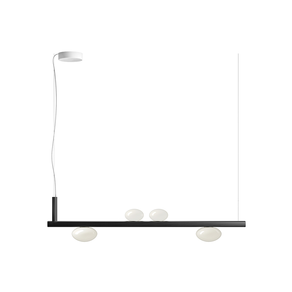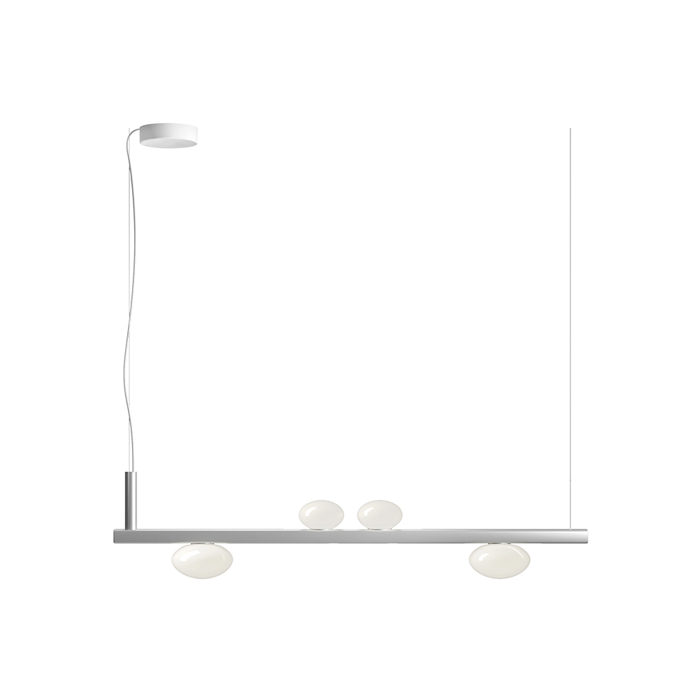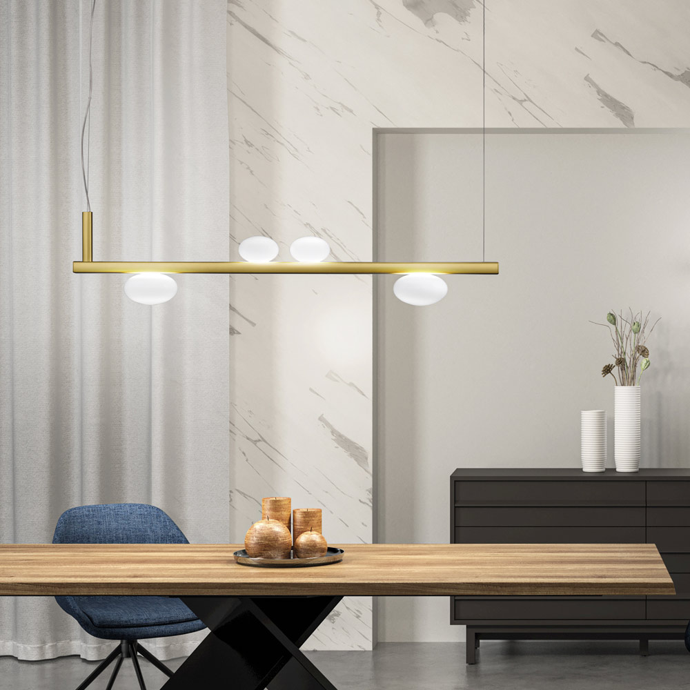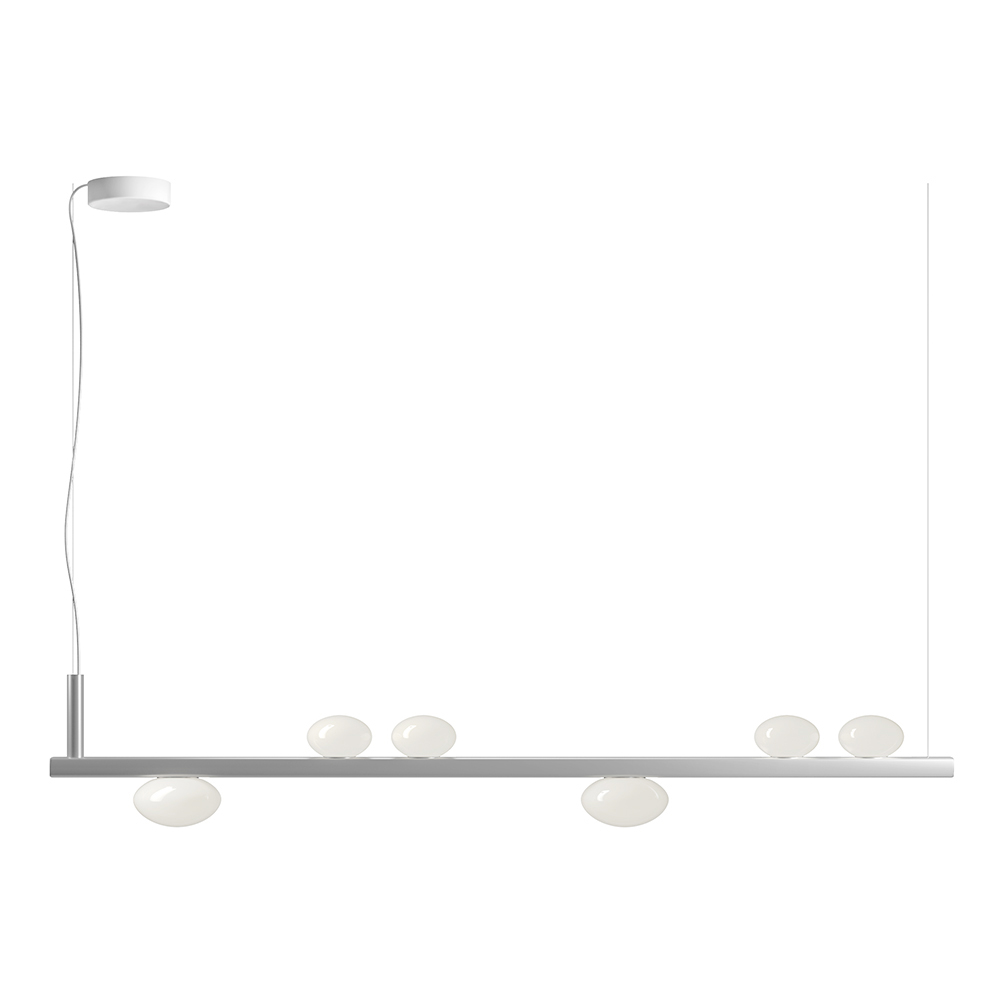 Diese Pendelleuchte ist eine wahre Ikone intelligenten Designs und diskreter Technologie . Ihre klare, lineare Struktur wird durch elegante, kugelförmige Diffusoren aus Opalglas ergänzt, die scheinbar im Gleichgewicht schweben und so einen modernen und leichten visuellen Effekt erzeugen.