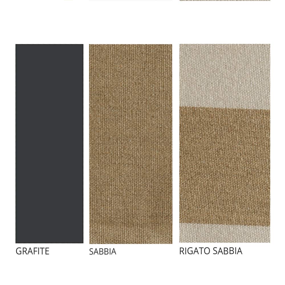 Outdoor-Wohnzimmerset bestehend aus Sofa, Sessel und Couchtisch , gefertigt in Italien mit einem graphitfarben lackierten Eisenrahmen , Sitz- und Rückenkissen aus sandfarbenem und gestreiftem technischem Stoff und einer Tischplatte aus Travertin . Dieses Einrichtungskonzept schafft die perfekte Balance zwischen Robustheit und ästhetischer Leichtigkeit und verleiht jedem Außenbereich eine einzigartige und raffinierte Note . Das originelle Detail der gestreiften Kissen harmoniert perfekt mit dem klassischen Stil der Eisenrahmen und schafft eine Komposition im modernen Stil, ideal, um herrliche Sonnentage in völliger Entspannung zu genießen.