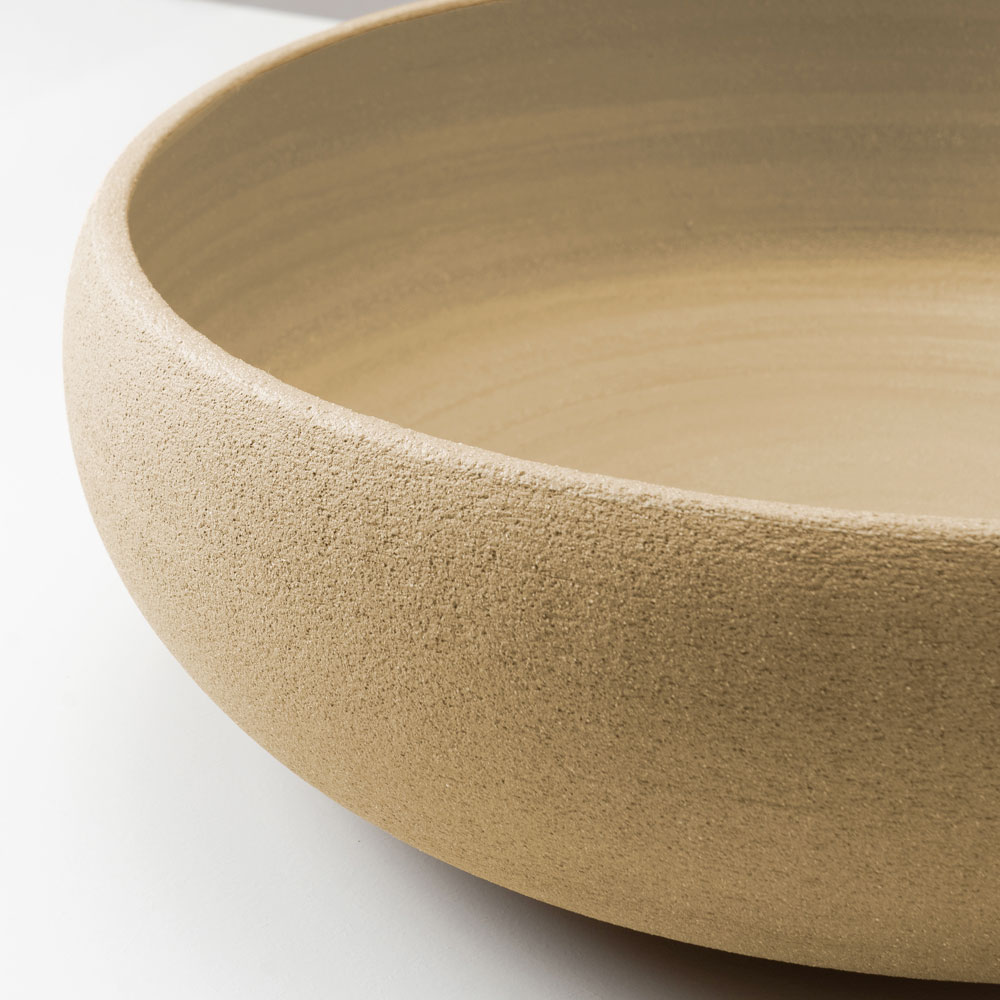 Die Innenseite ist mit einem glänzenden, transparenten Kristallglas versehen, das für eine glatte und helle Oberfläche sorgt, während die Außenseite die strukturierte Optik von Schamotte beibehält und in zwei Farbvarianten erhältlich ist. Der Kontrast zwischen den emaillierten und den naturbelassenen Oberflächen unterstreicht den handwerklichen Charakter des Waschbeckens.