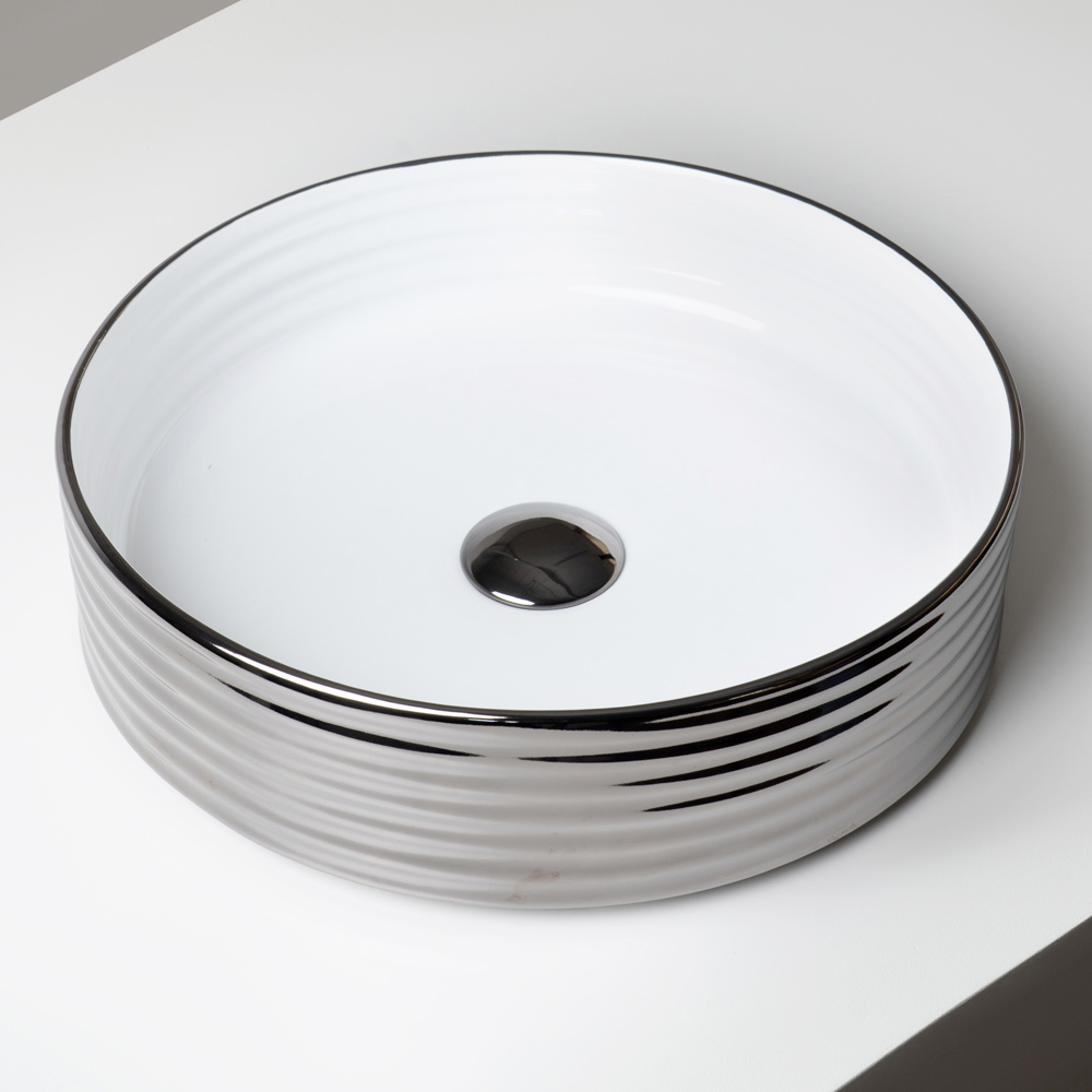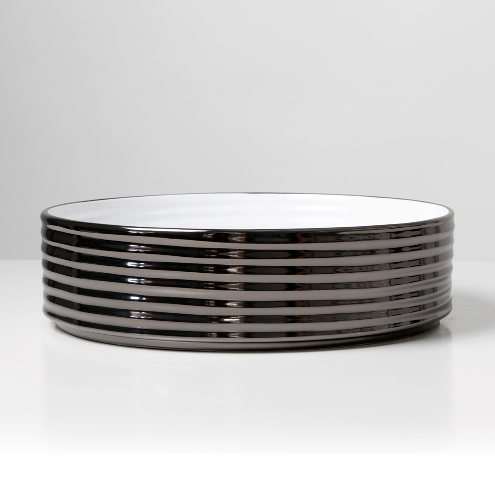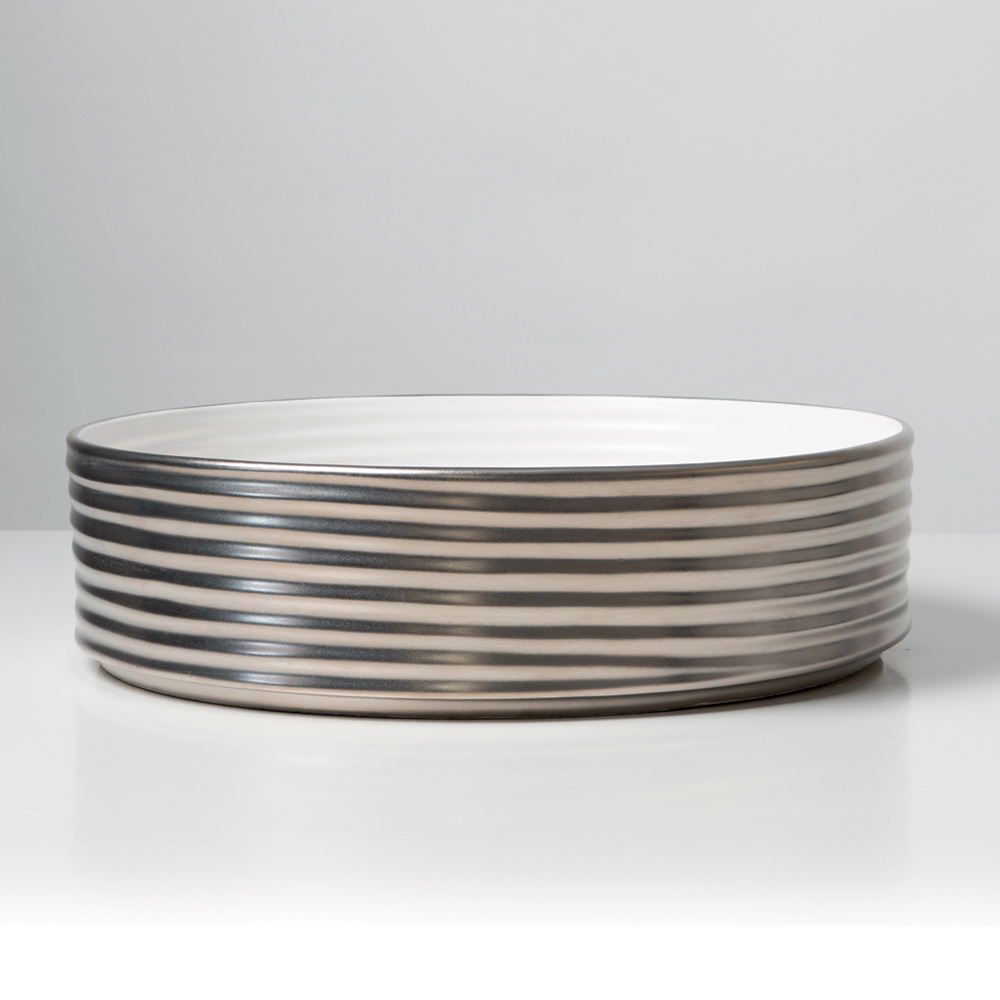 Dieses handgedrehte Aufsatzwaschbecken aus Feinsteinzeug besticht durch seine wellenförmige Oberfläche mit horizontalen Bändern , die das Licht einfangen und das Material in ein fließendes, weiches und zugleich edles Element verwandeln. Ein Designobjekt, das ästhetische Forschung und handwerkliche Meisterschaft vereint.