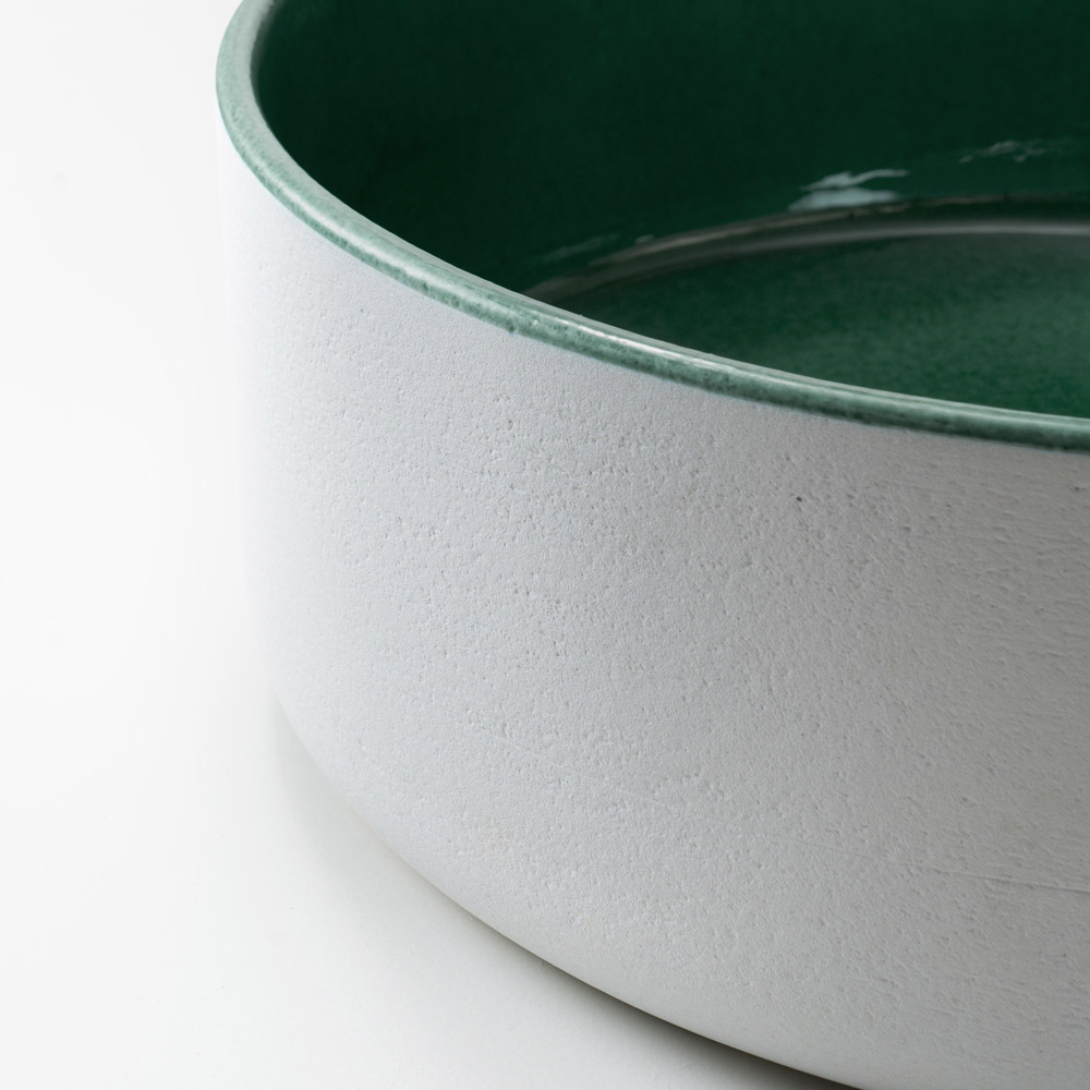 • Smaragdgrüne Emaille im Inneren und strukturierte weiße Oberfläche außen
