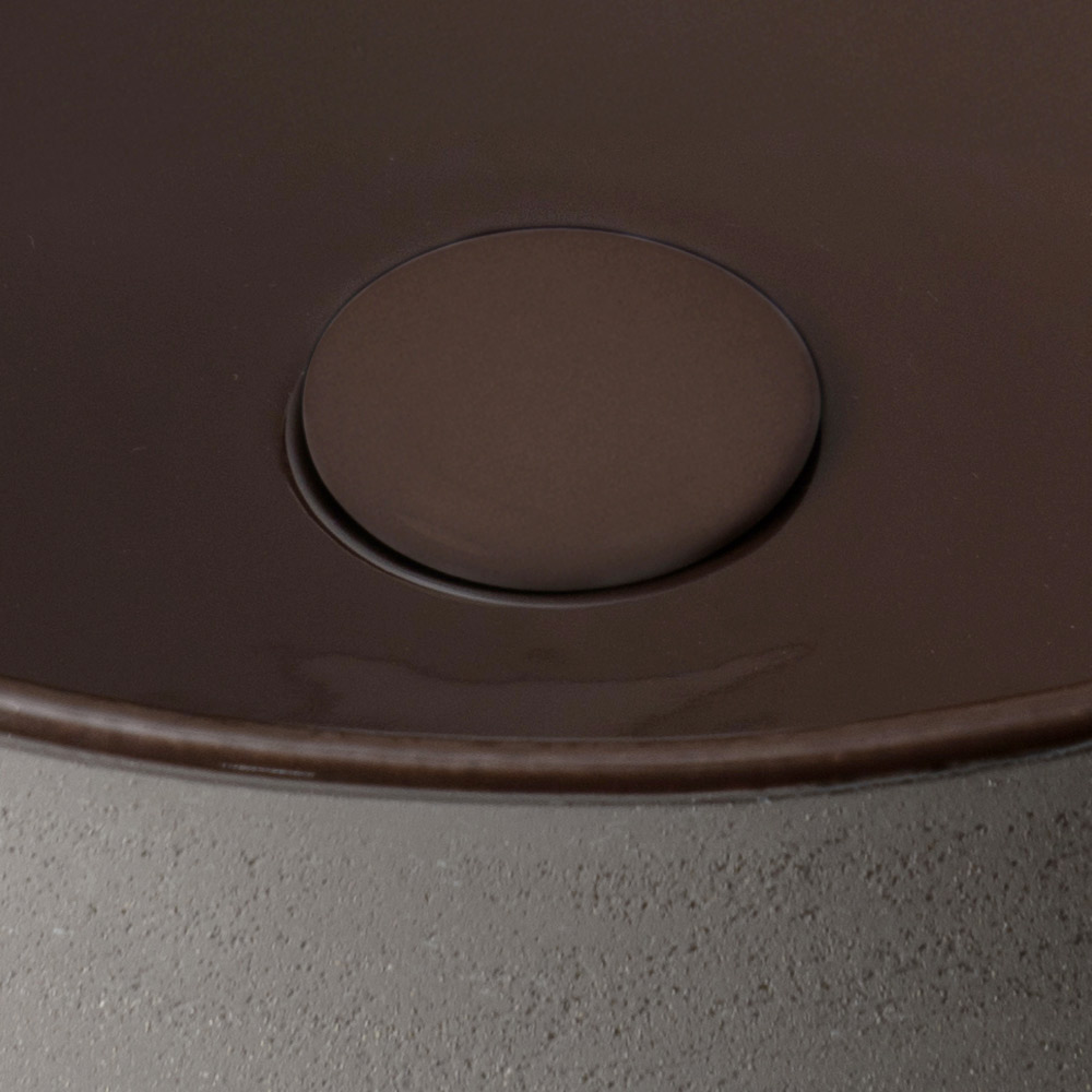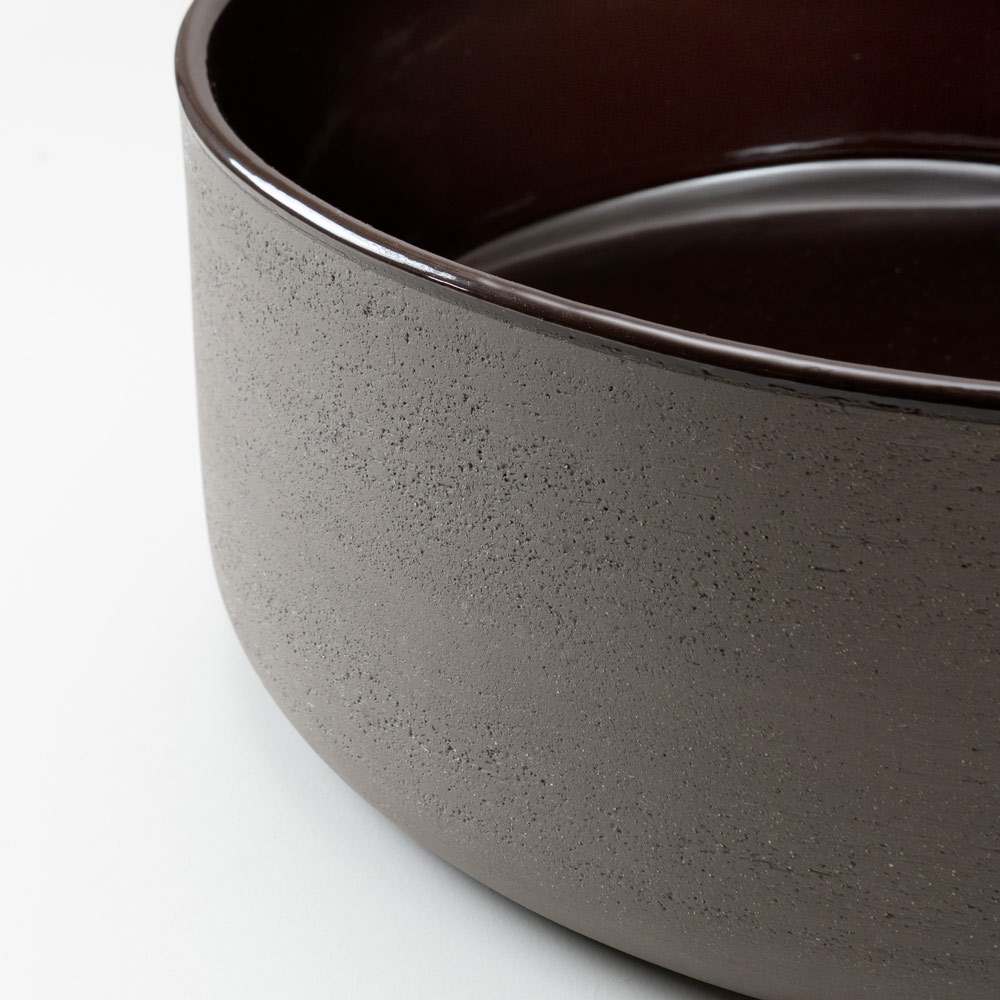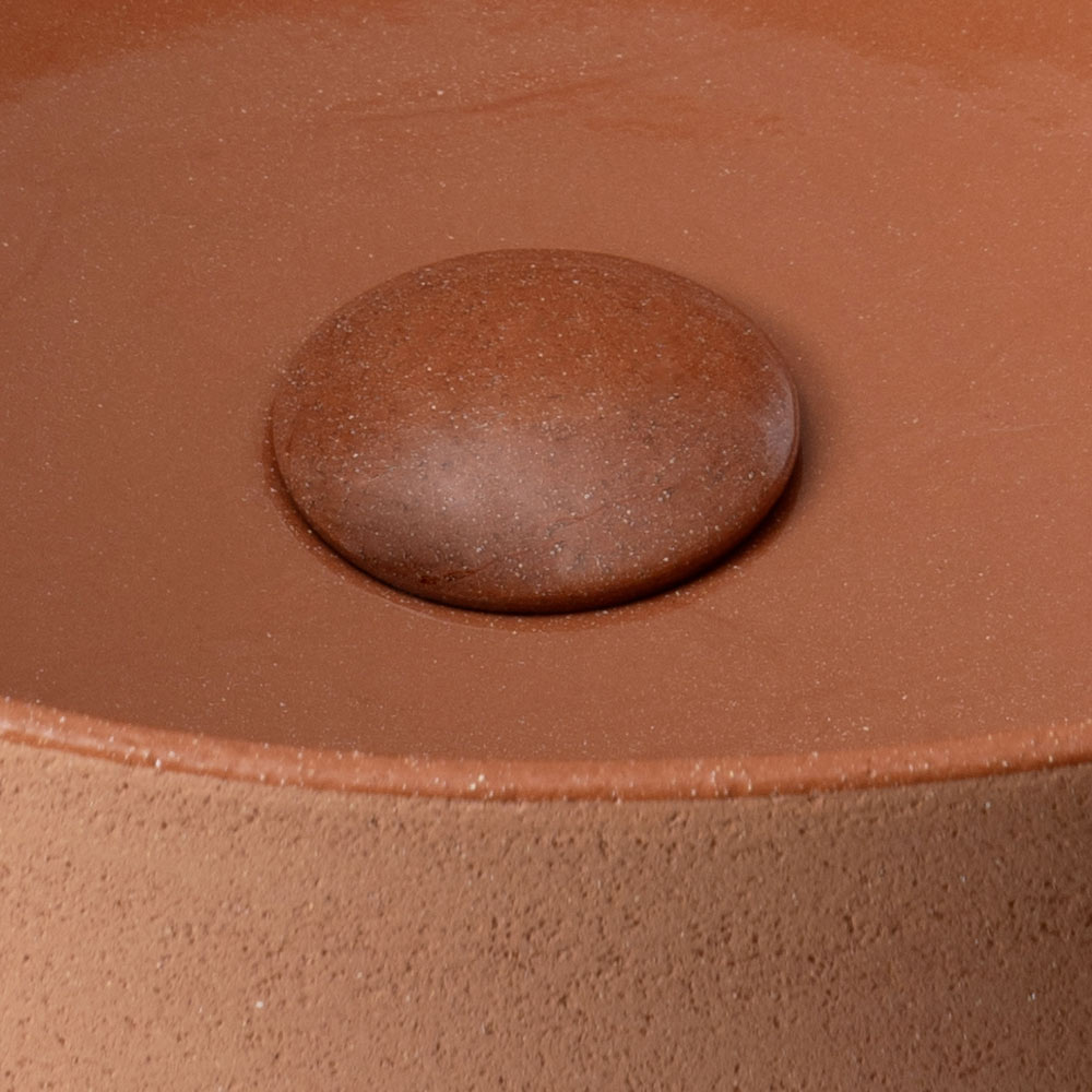 Das Aufsatzwaschbecken aus Naturerde besticht durch seine schlichte Form und die markante Oberflächenstruktur. Ein Designobjekt, das handwerkliches Können und ästhetische Raffinesse vereint und dem Badezimmer zeitgenössische Eleganz verleiht.