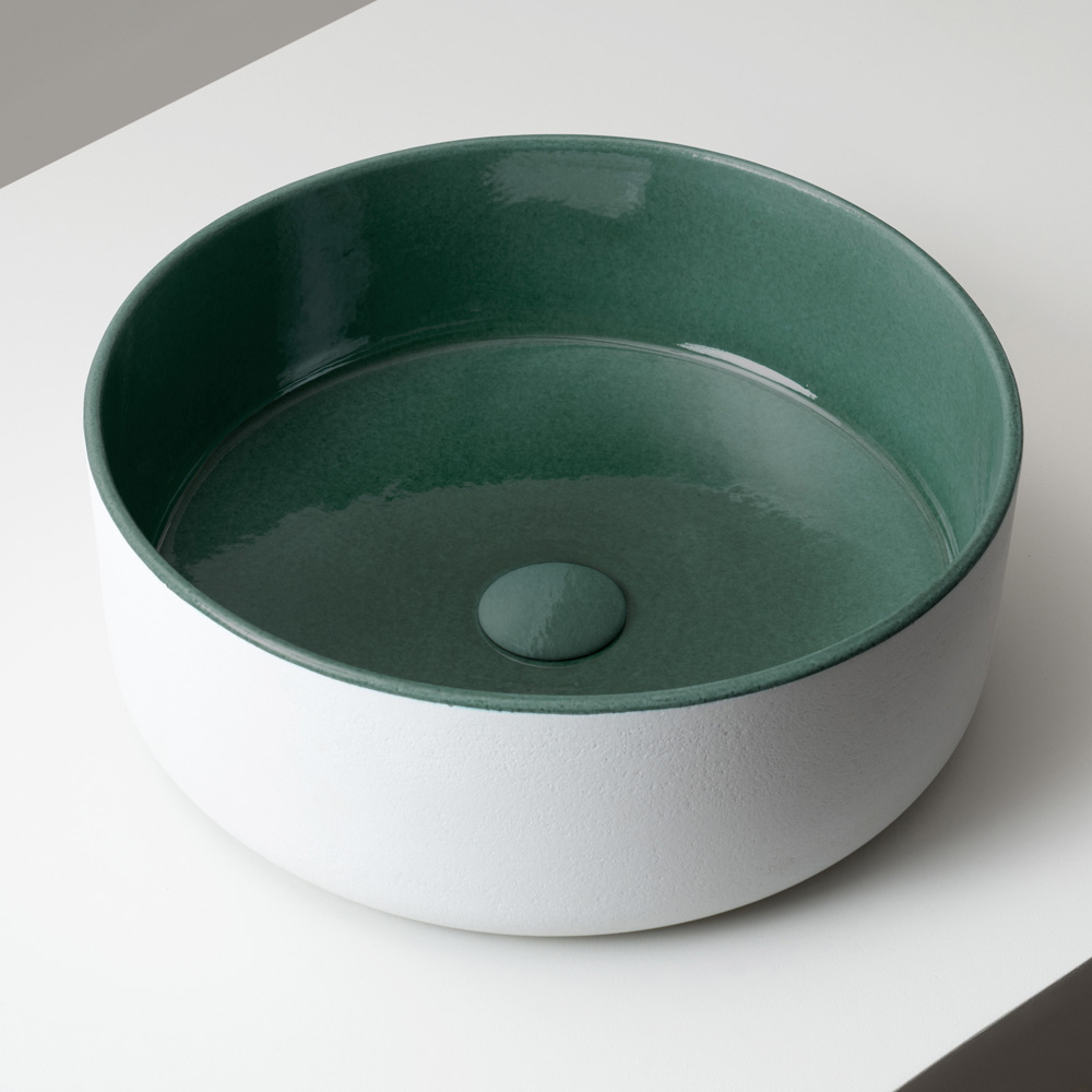 Die unterschiedlichen Kombinationen von Emaille und natürlichen Oberflächen erzeugen raffinierte Kontraste zwischen Innen und Außen, wodurch jedes Waschbecken sowohl ein dekoratives als auch ein funktionales Element darstellt.