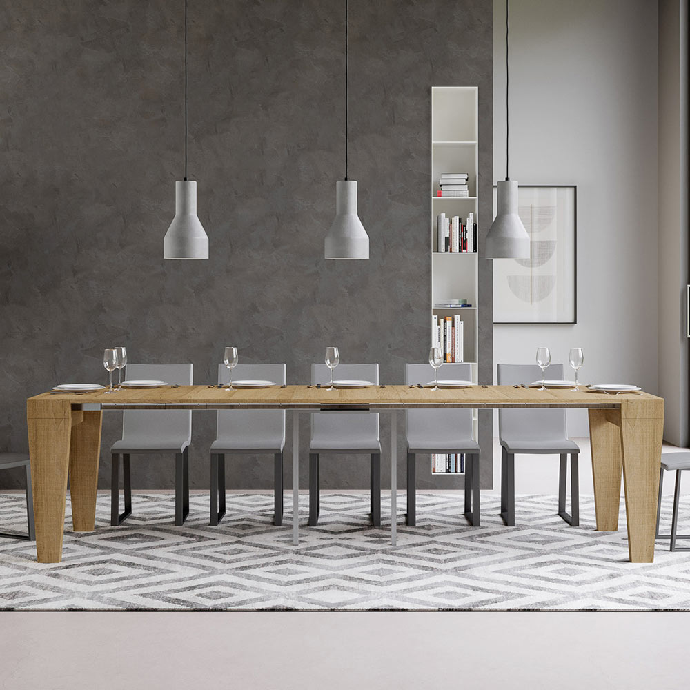 Dieser ausziehbare Konsolentisch ist ideal, um den Raum zu optimieren: Er ist kompakt, wenn er geschlossen ist, und lässt sich leicht ausziehen, um eine Arbeitsfläche zu bieten oder eine Dinnerparty zu veranstalten. Er ist ein Symbol für Vielseitigkeit und Anpassungsfähigkeit. È entworfen für diejenigen, die eine Kombination aus Praktikabilität und anspruchsvollem Stil in ihren Möbeln suchen.