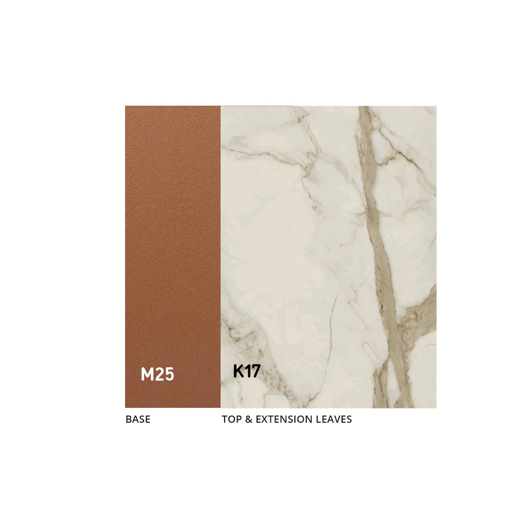 Tisch mit geprägtem, kupferfarben lackiertem Metallgestell und 3 mm starker Keramikplatte.