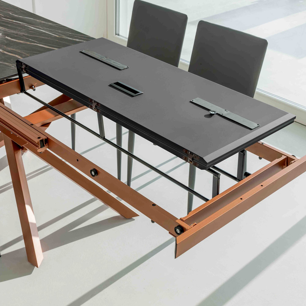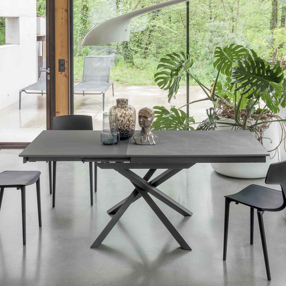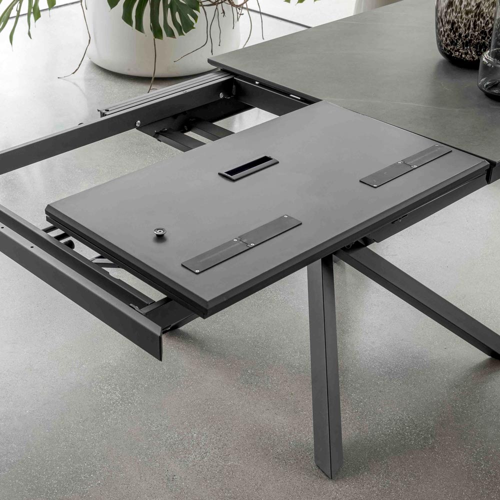 Ausziehbarer Tisch mit Keramikplatte und Metallgestell . Teleskopmechanismus und synchronisierte Öffnung mit interner Buchverlängerung , komplett in Italien hergestellt.
