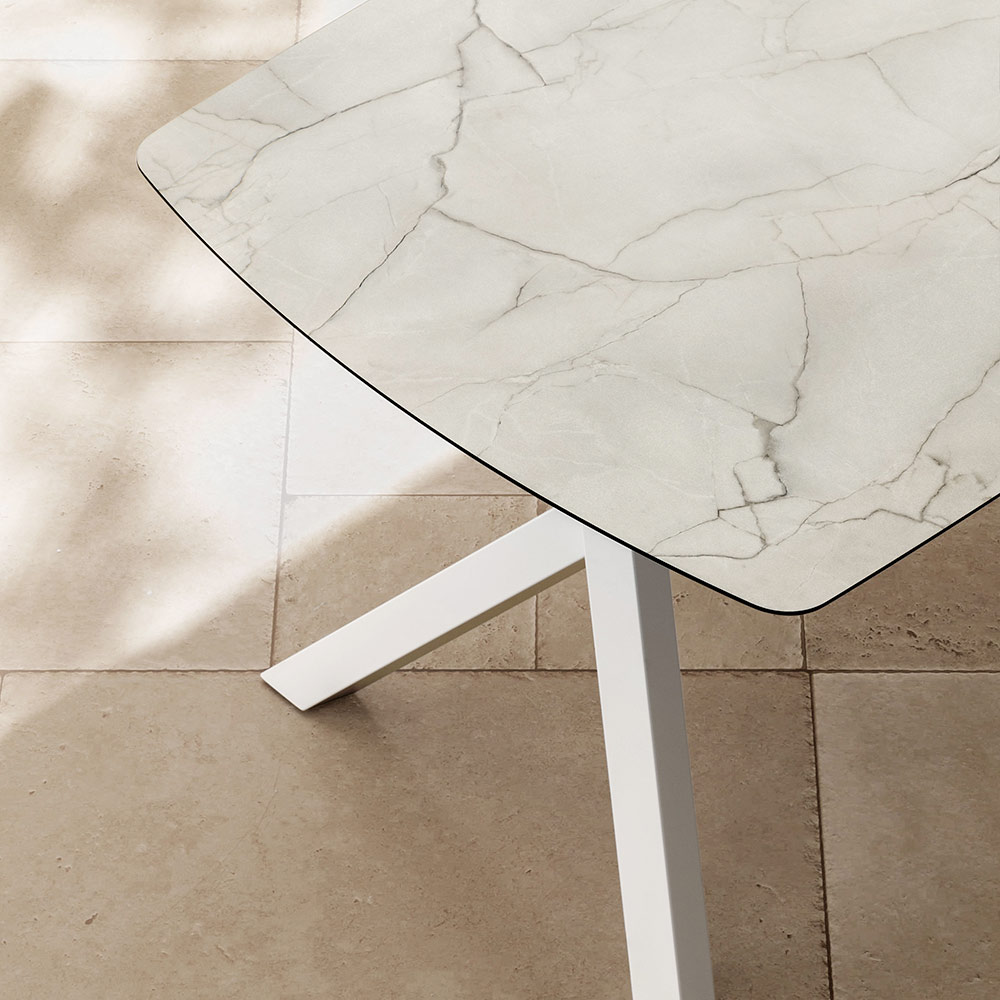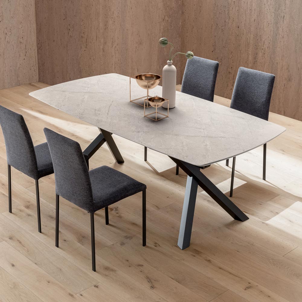 Die lackierte Metallstruktur mit gekreuzten Beinen mit starker optischer Wirkung verleiht Stabilität, Robustheit und architektonischen Stil und macht diesen Tisch perfekt für moderne, elegante und offene Raumumgebungen.