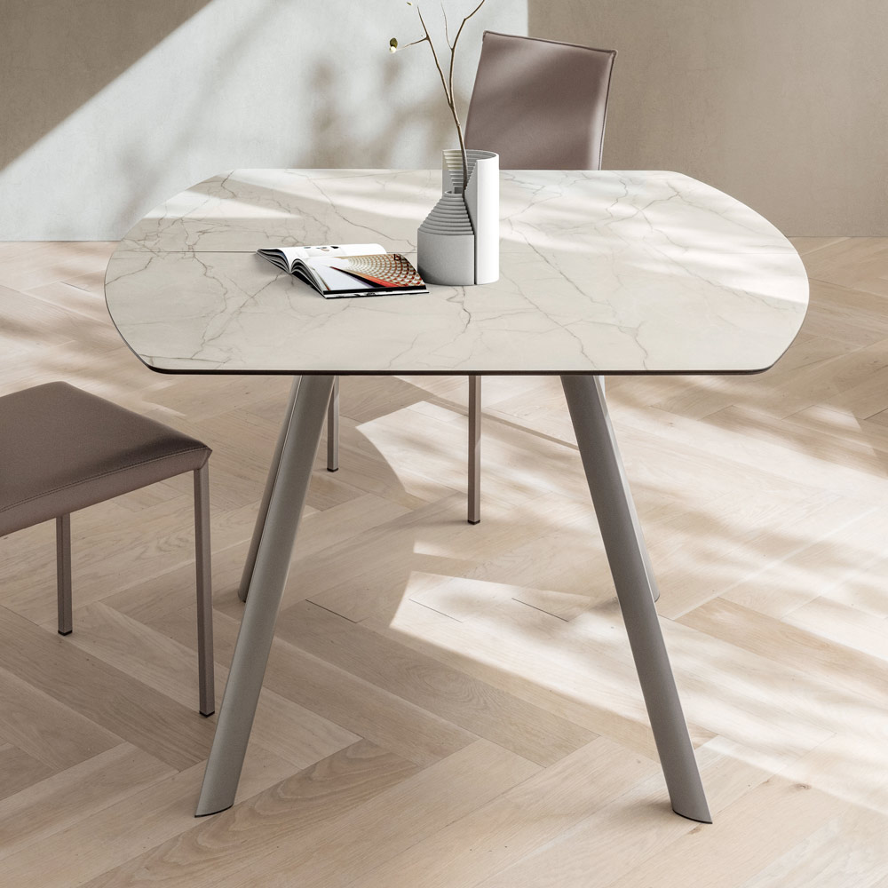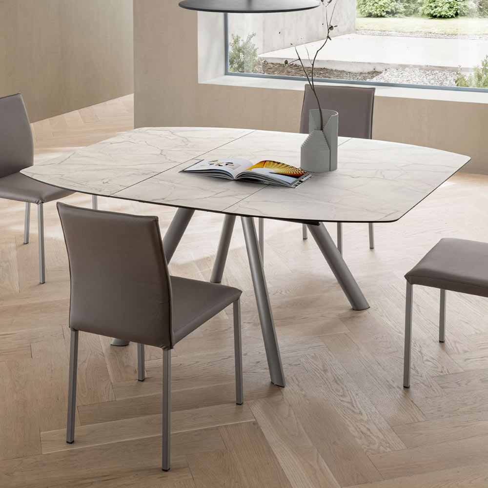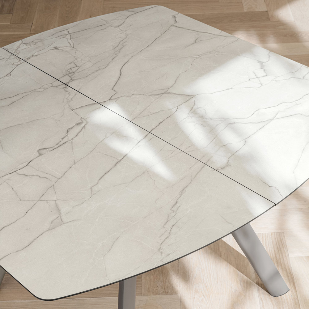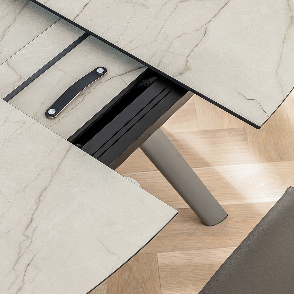 Die HPL- Platte verleiht der Umgebung Helligkeit und Raffinesse und erinnert mit ihrer widerstandsfähigen Oberfläche an die Adern des Steins. Dank des zentralen Ausziehsystems lässt sich der Tisch leicht ausziehen und bietet zusätzlichen Platz für Gäste oder Familienessen. Auch im geöffneten Zustand behält er eine harmonische Linie.