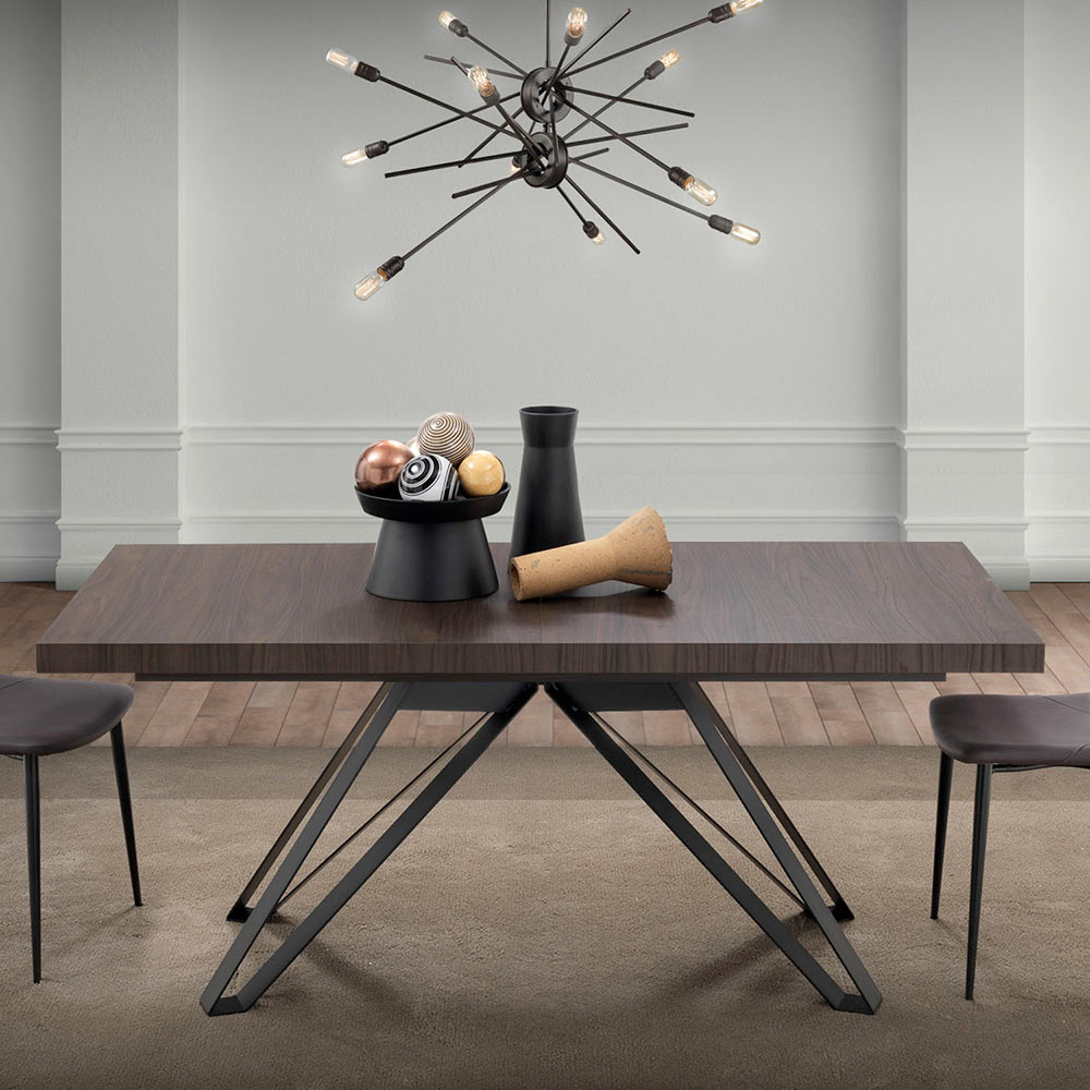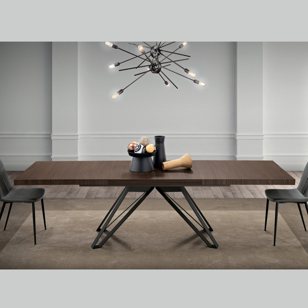 Ausziehbarer Wohnzimmertisch mit Platte und Verlängerungen aus klappbarem Melamin (Stärke 55 mm), Finish in Avantgarde-Nussbaum mit Registerporen und Untergestell aus mattschwarz lackiertem Metall, komplett in Italien hergestellt.