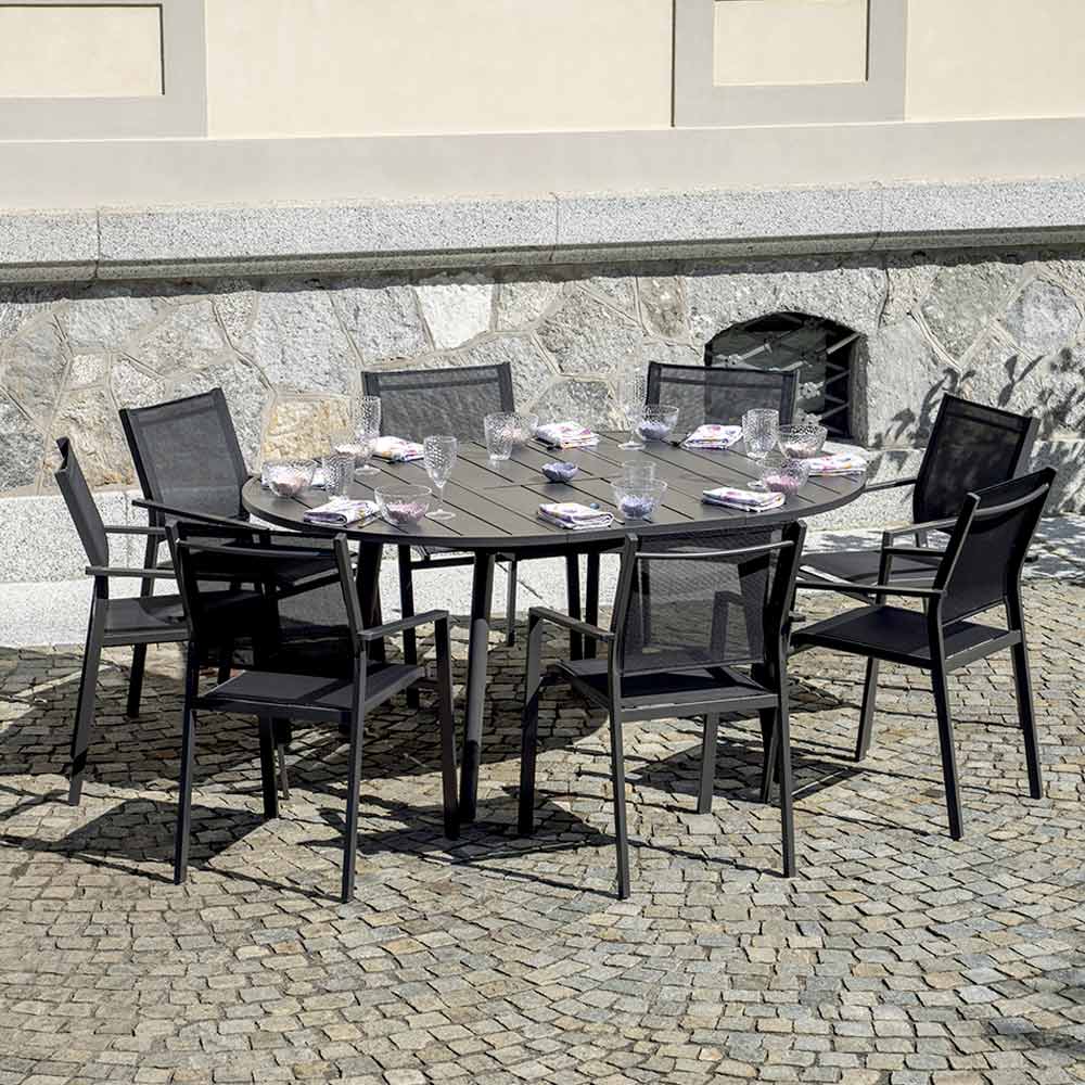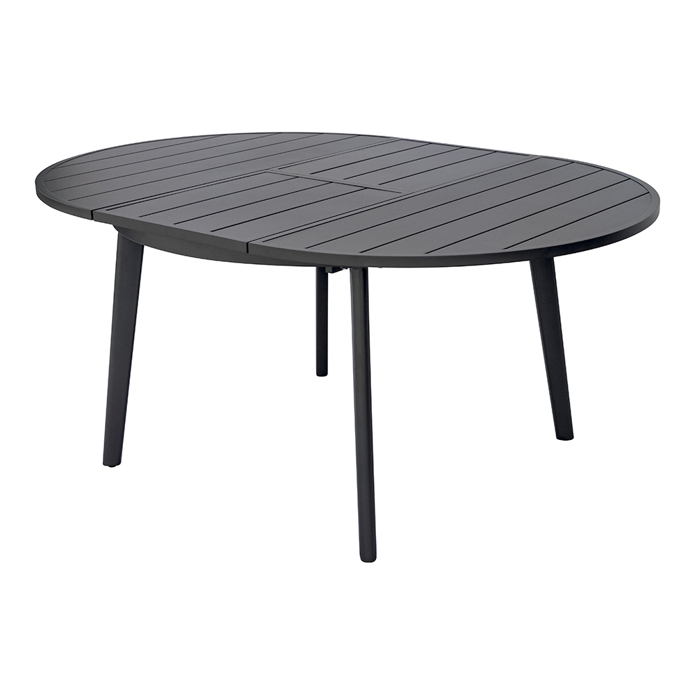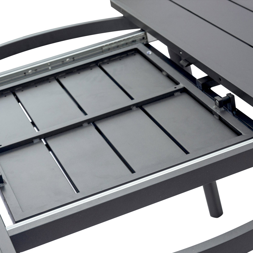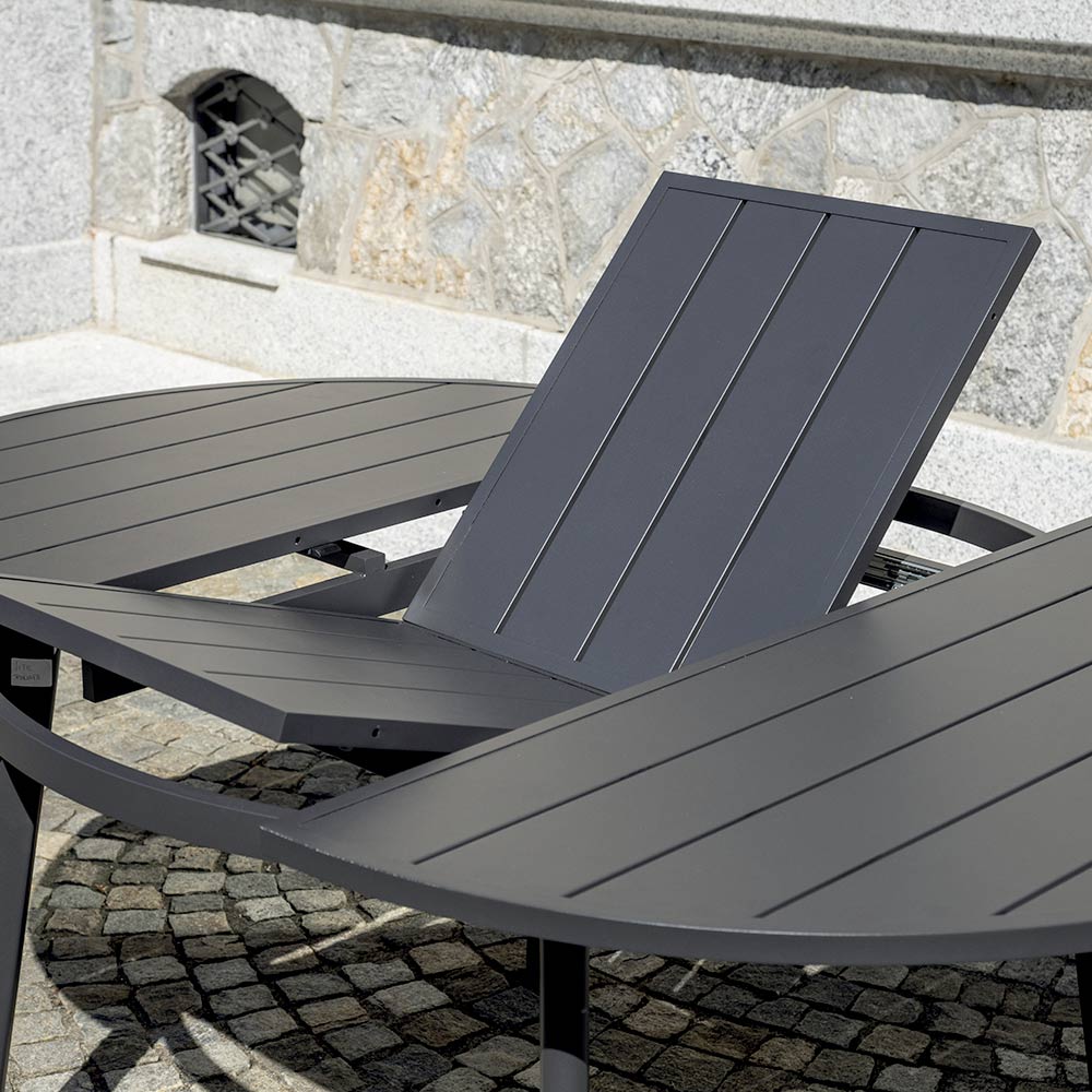 Die anthrazitfarbene Aluminium-Tischplatte garantiert Robustheit und Langlebigkeit und widersteht Witterungseinflüssen perfekt, ohne mit der Zeit ihren Glanz zu verlieren. Die eleganten, gleichmäßigen Latten verleihen dem Tisch ein edles, modernes Aussehen, während die solide Konstruktion gleichzeitig für Stabilität und Leichtigkeit sorgt.