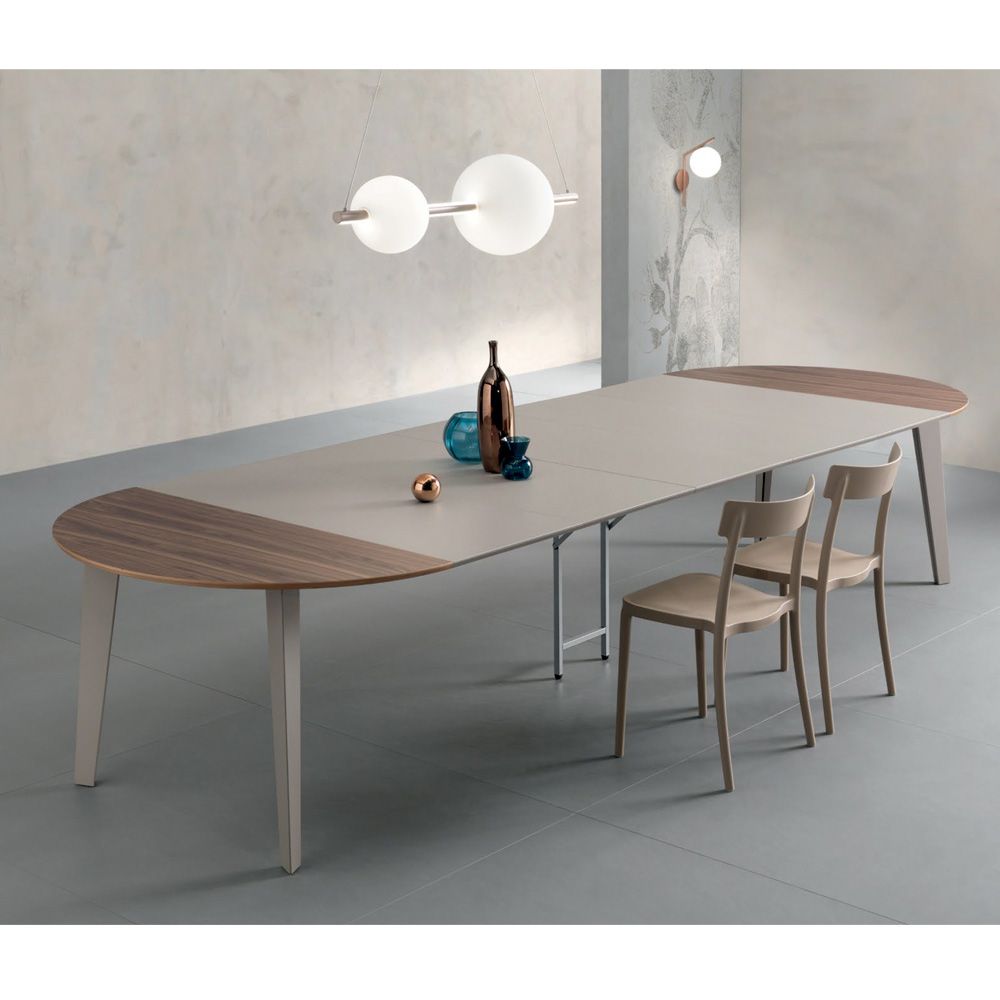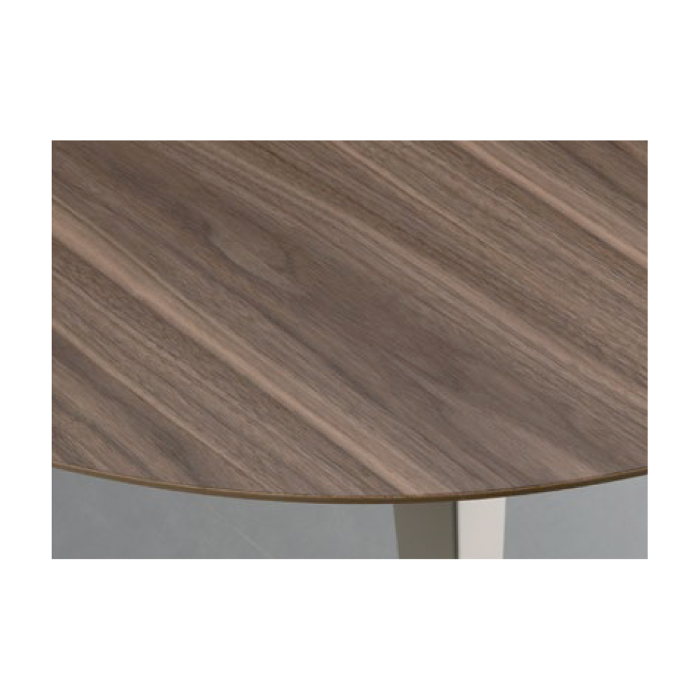 Runder Tisch, Durchmesser 120 cm, ausziehbar auf 276 oder 380 cm, mit 20 mm dicker Canaletto-Nussbaumfurnierplatte und geneigtem Profil.