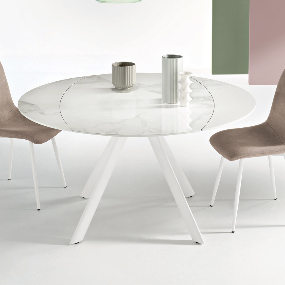 Dank der praktischen Drehplatte lässt sich der Tisch von rechteckig zu rund verwandeln und passt sich so mühelos unterschiedlichen Raum- und Gesellschaftsbedürfnissen an. Die beiden 24 cm langen Verlängerungsplatten vergrößern die Tischfläche und machen den Tisch ideal für den täglichen Gebrauch sowie für gesellige Runden mit Freunden und Familie.