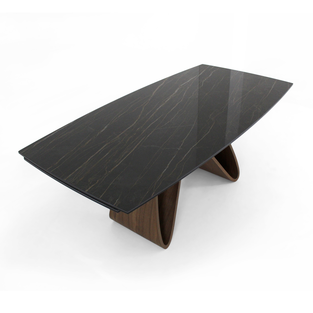 Ausziehbarer Wohnzimmer-Fasstisch mit integrierten Verlängerungen,Keramikplatte , gerader Kante, Basis aus Canaletto-Walnussfurnier und verstellbaren Füßen. Dank der Form des Untergestells und der Ausführung der Tischplatte kann der Tisch jedem Alltags- und Objektbereich einen Hauch von Bewegung und Eleganz verleihen. Die Materialien garantieren Funktionalität und Zweckmäßigkeit , sodass ein Produkt entsteht, das nicht nur optisch sehr schön ist, sondern auch zu jeder Gelegenheit verwendet werden kann.