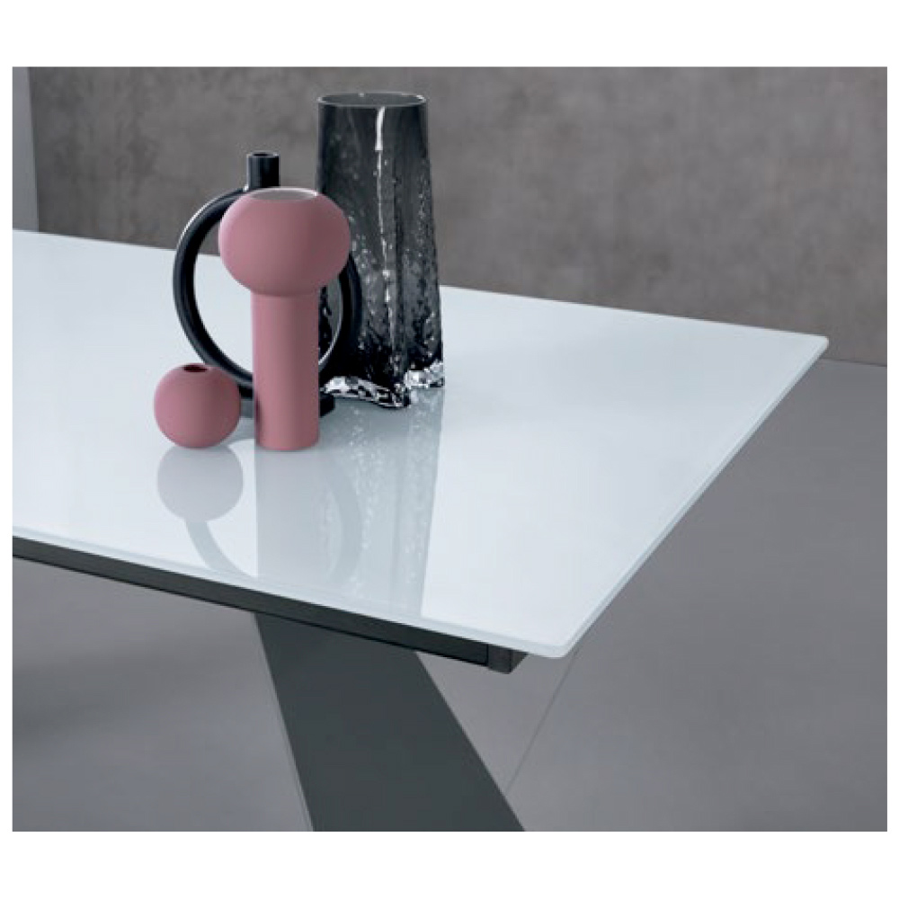 Dieser Tisch vereint architektonische Kreativität und zeitgenössische Eleganz und verwandelt jeden Raum in einen stilvollen Ort . Die 10 mm dicke Milchglasplatte verkörpert pure Eleganz. , während der dünne und leicht geneigte Rand für optische Leichtigkeit und einen Hauch von Modernität sorgt.
