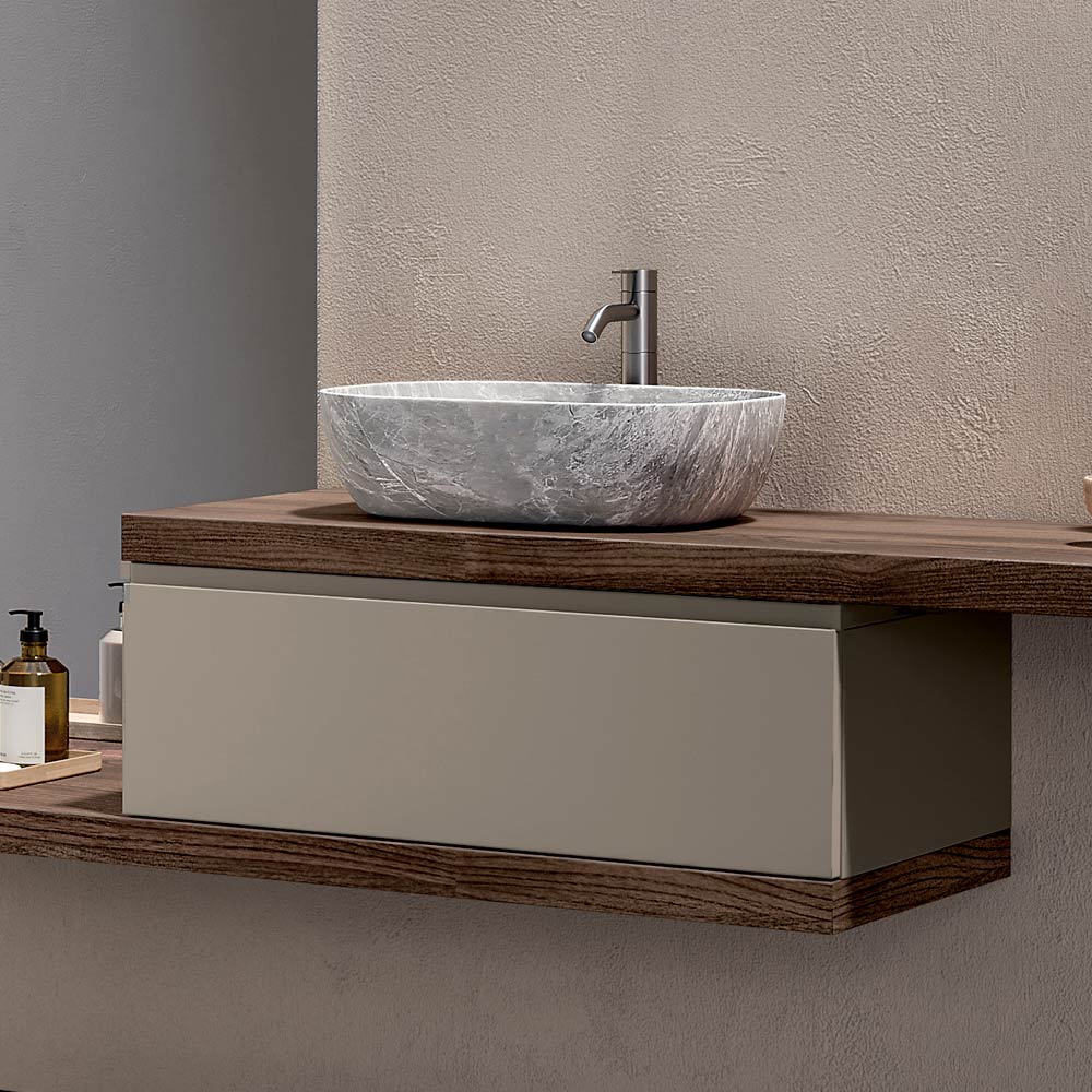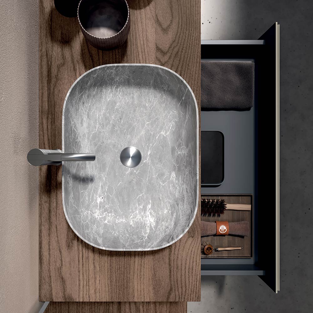 Das graue Steinkeramik-Waschbecken verleiht dem Ganzen eine raffinierte Note: kompakt, funktional und perfekt in die Komposition integriert, vereint es Widerstandsfähigkeit und Stil in einem einzigen Element.