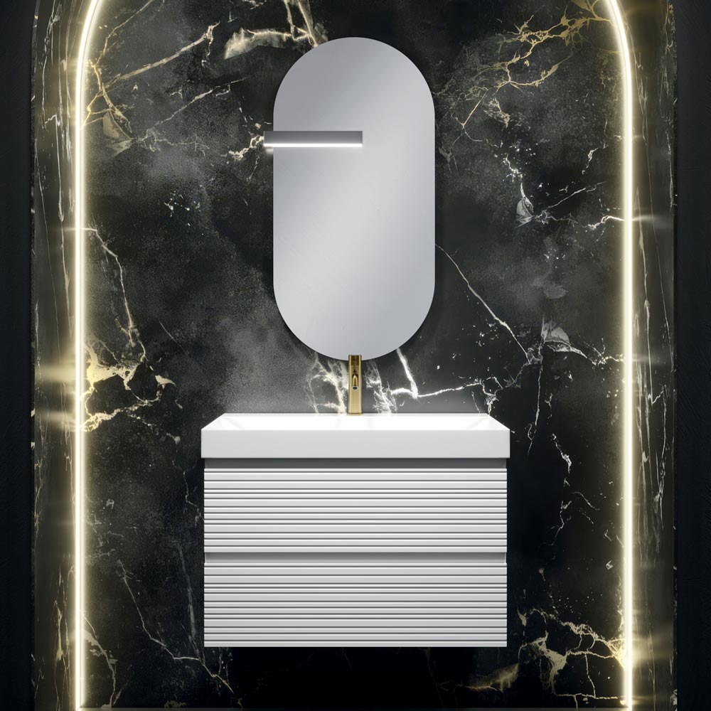 Mattweißer, wandhängender Badezimmerschrank mit Just-Waschbecken, geformtem Spiegel und LED-Beleuchtung
