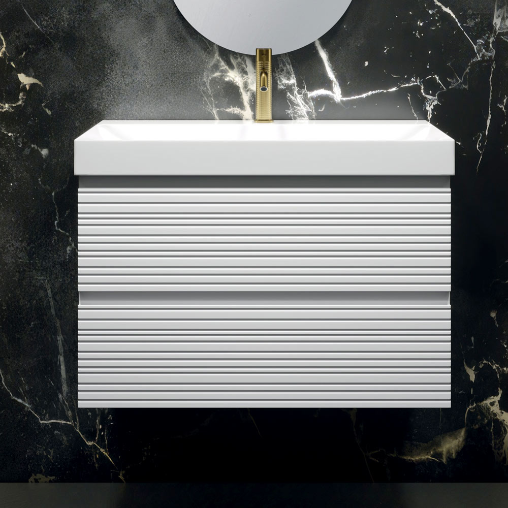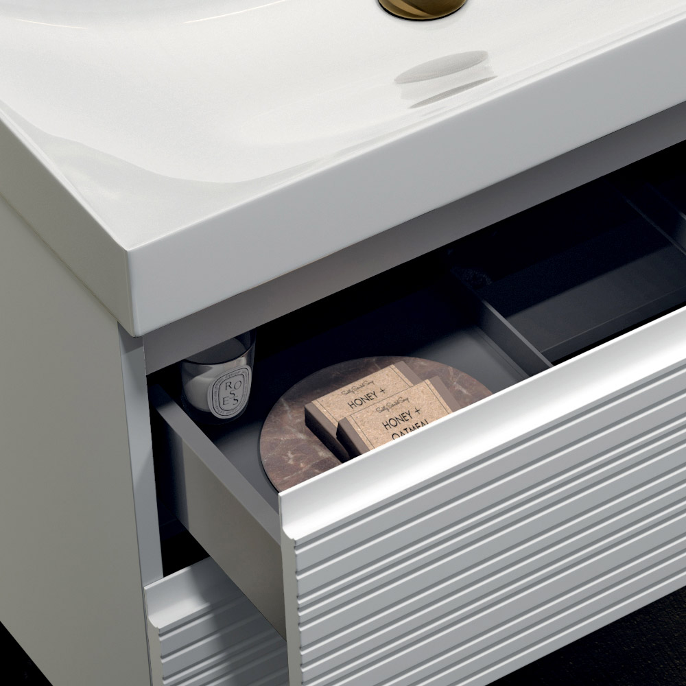 Der hängende Badezimmerschrank mit zwei Schubladen in elegantem Mattweiß bietet viel Stauraum und eine klare Ästhetik und eignet sich ideal zur Aufwertung moderner und heller Umgebungen.