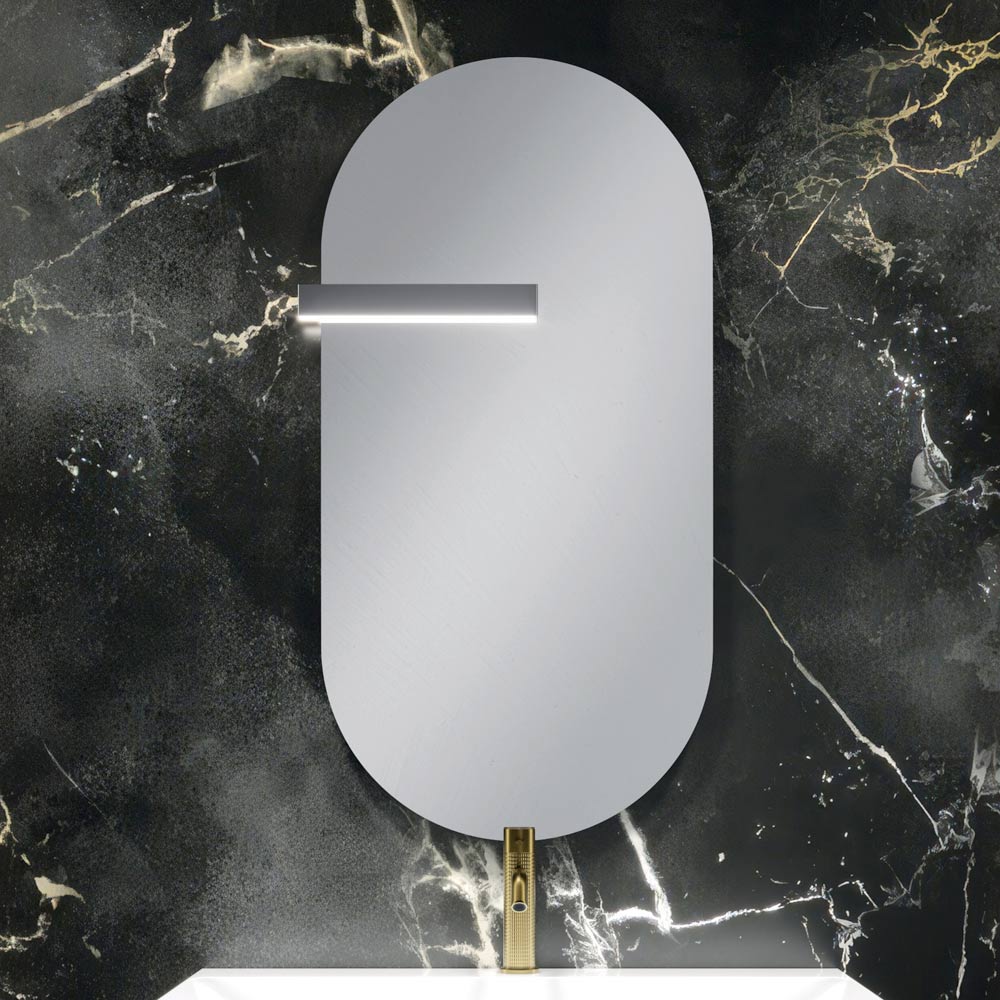 Der geformte Spiegel wird zu einem szenografischen Element mit starker visueller Wirkung, das die Tiefe des Raumes verstärkt und mit der umgebenden Architektur interagiert.