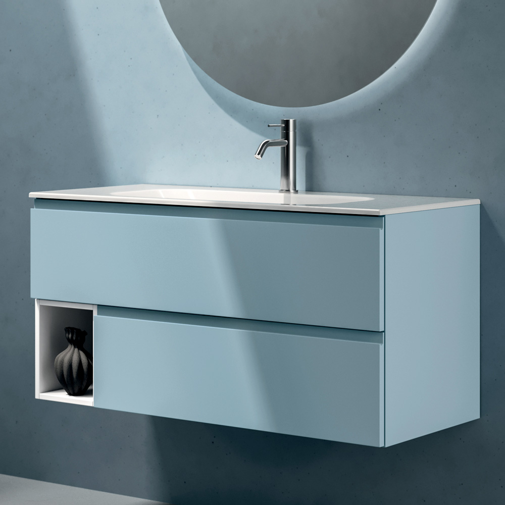 Die Komposition bietet eine frische und zeitgemäße Interpretation von Badezimmermöbeln, die sich durch schwebende Formen, matte Oberflächen und zarte Farbtöne auszeichnet, welche dem Raum Helligkeit und Leichtigkeit verleihen.