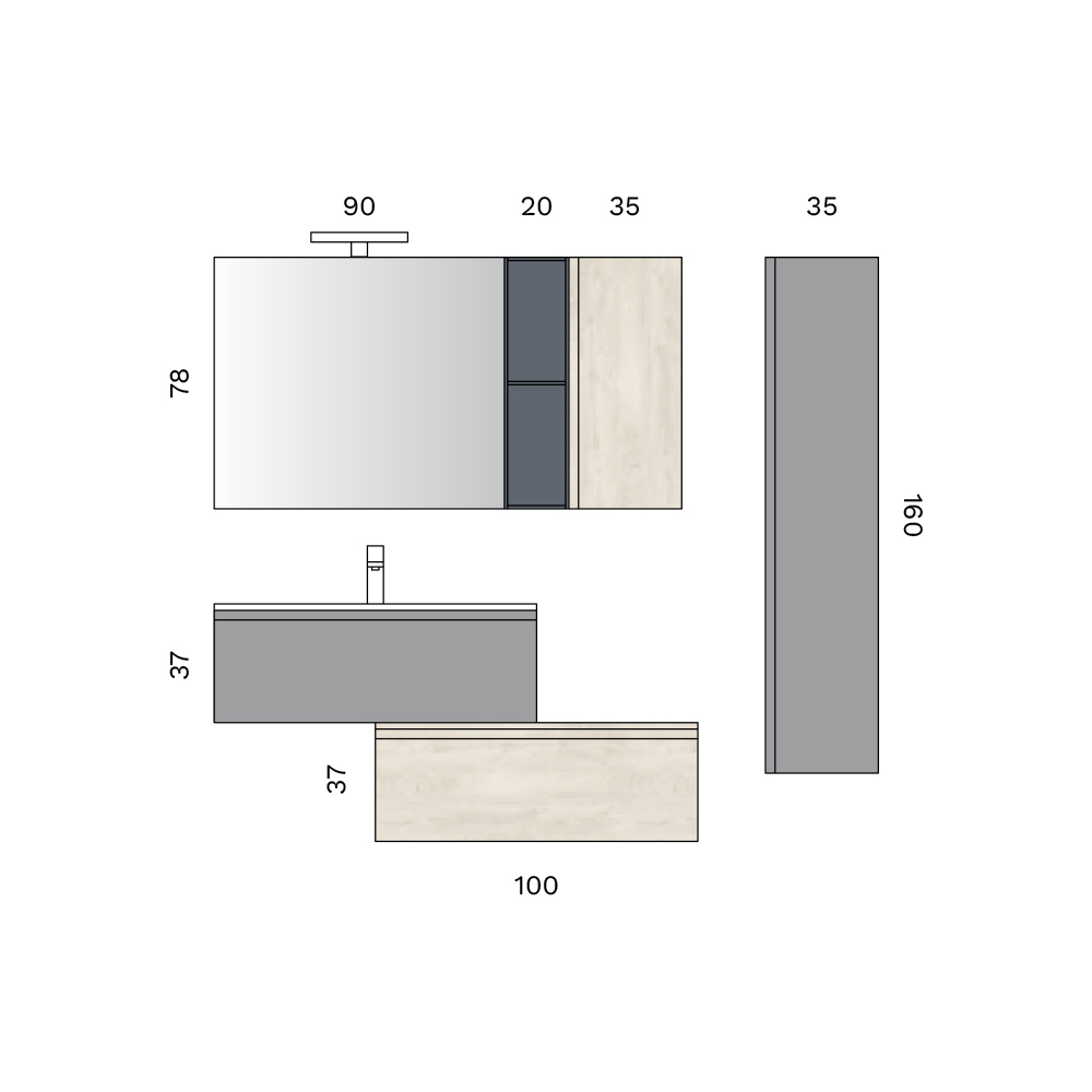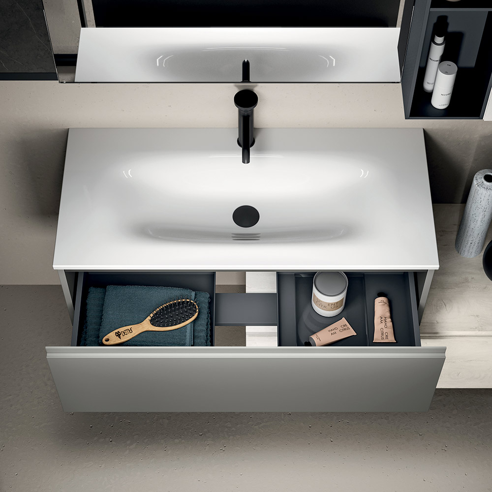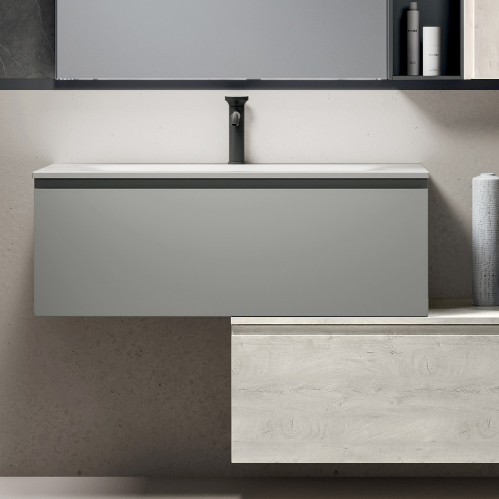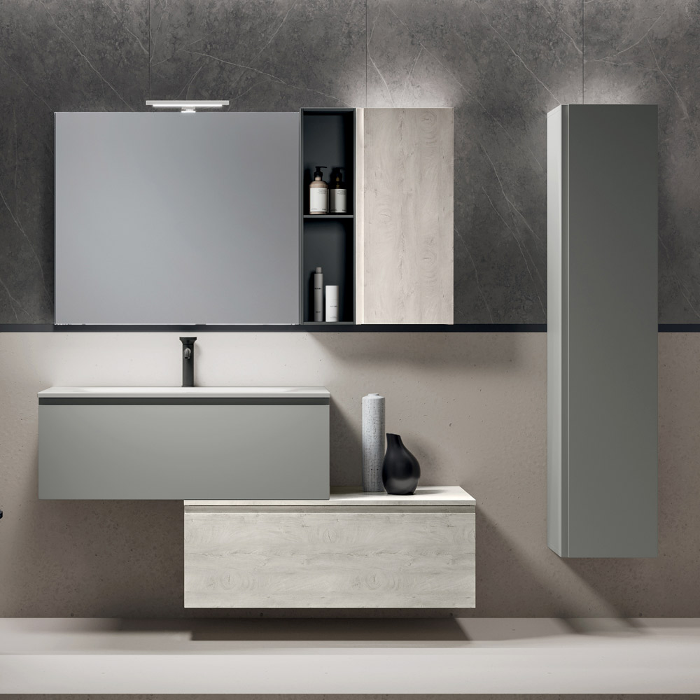 Die hängende Wandeinheit in der Ausführung „Alaska-Eiche“ und das offene Element in Anthrazit bereichern die Konstruktion mit funktionalen und dekorativen Lösungen und eignen sich ideal zur Organisation und individuellen Gestaltung des Badezimmers auf elegante und praktische Weise.
