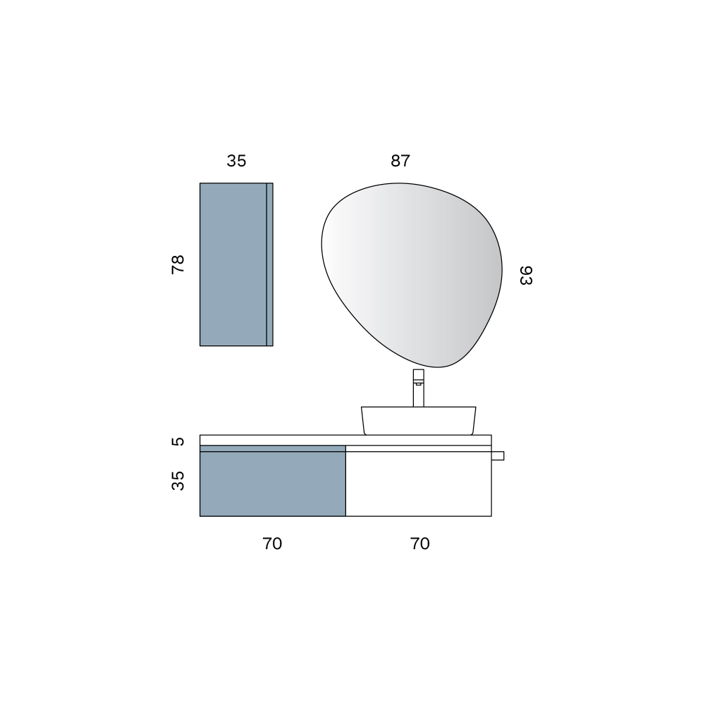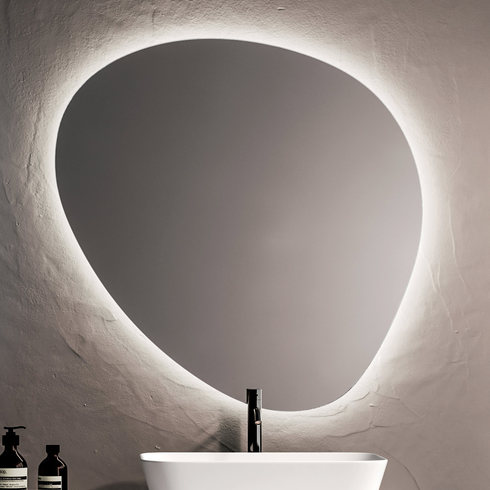Das zentrale Element der Komposition ist der geschwungene LED-Spiegel , der ein sanftes, umhüllendes Licht entlang des Randes wirft, den Badezimmerraum optisch vergrößert und eine elegante, entspannende Atmosphäre schafft. Die integrierte Beleuchtung erhöht den Sehkomfort und unterstreicht den modernen Charakter des Raumes.