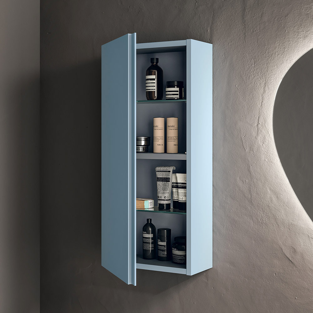 Die dazu passende, tiffanyfarbene Wandeinheit rundet das Ensemble ab und eignet sich ideal zur Erweiterung des Stauraums, ohne die Komposition zu überladen, wodurch eine raffinierte und minimalistische ästhetische Kohärenz erhalten bleibt.