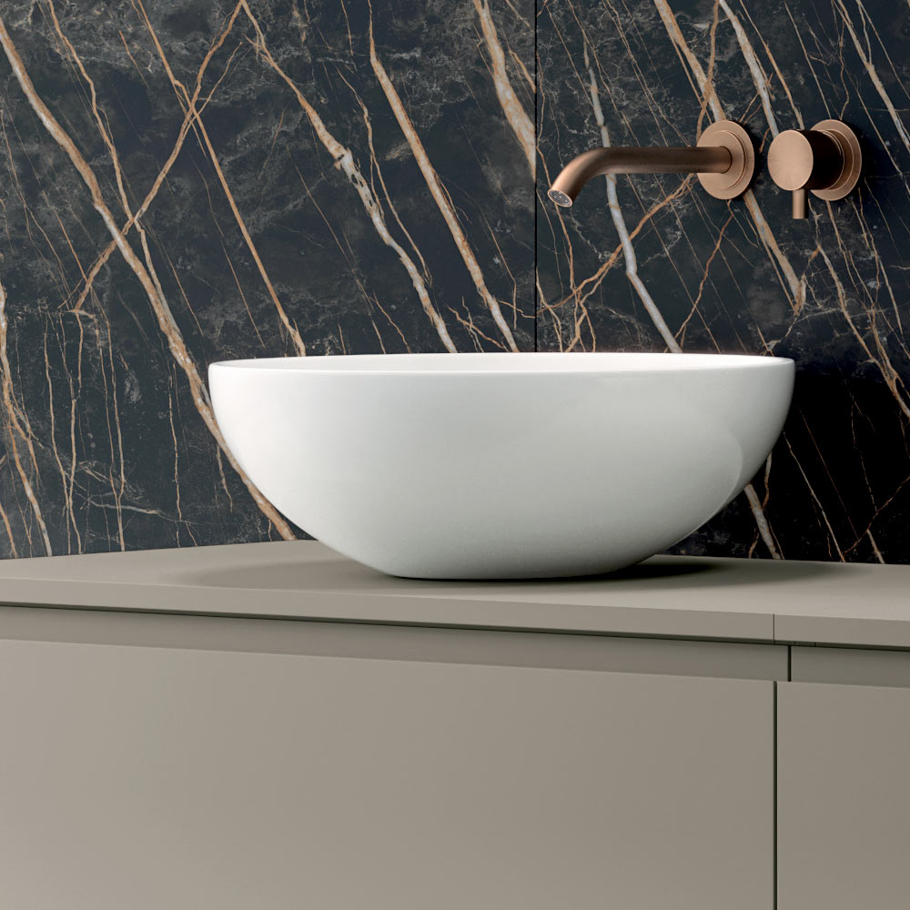 Die beiden glänzend weißen Keramik-Aufsatzwaschbecken mit ihren schlichten und harmonischen Formen gewährleisten täglichen Komfort und einfache Reinigung und bieten gleichzeitig eine ansprechende Ästhetik. Die Doppelwaschbecken-Konfiguration macht das Badezimmer ideal für Hauptbäder oder Gemeinschaftsbäder.