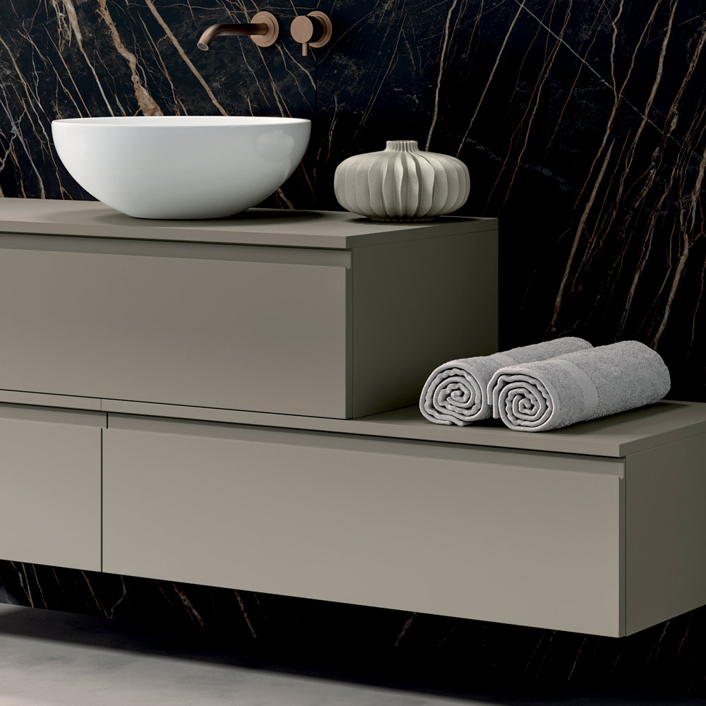 Die Konstruktion besteht aus zwei wandmontierten Unterschränken mit je einer Schublade in mattem Taubengrau , die viel Stauraum bieten und eine optimale Raumnutzung ermöglichen. Der integrierte Siphon sorgt für eine klare, minimalistische Ästhetik und unterstreicht die optische Kontinuität des Gesamtdesigns.
