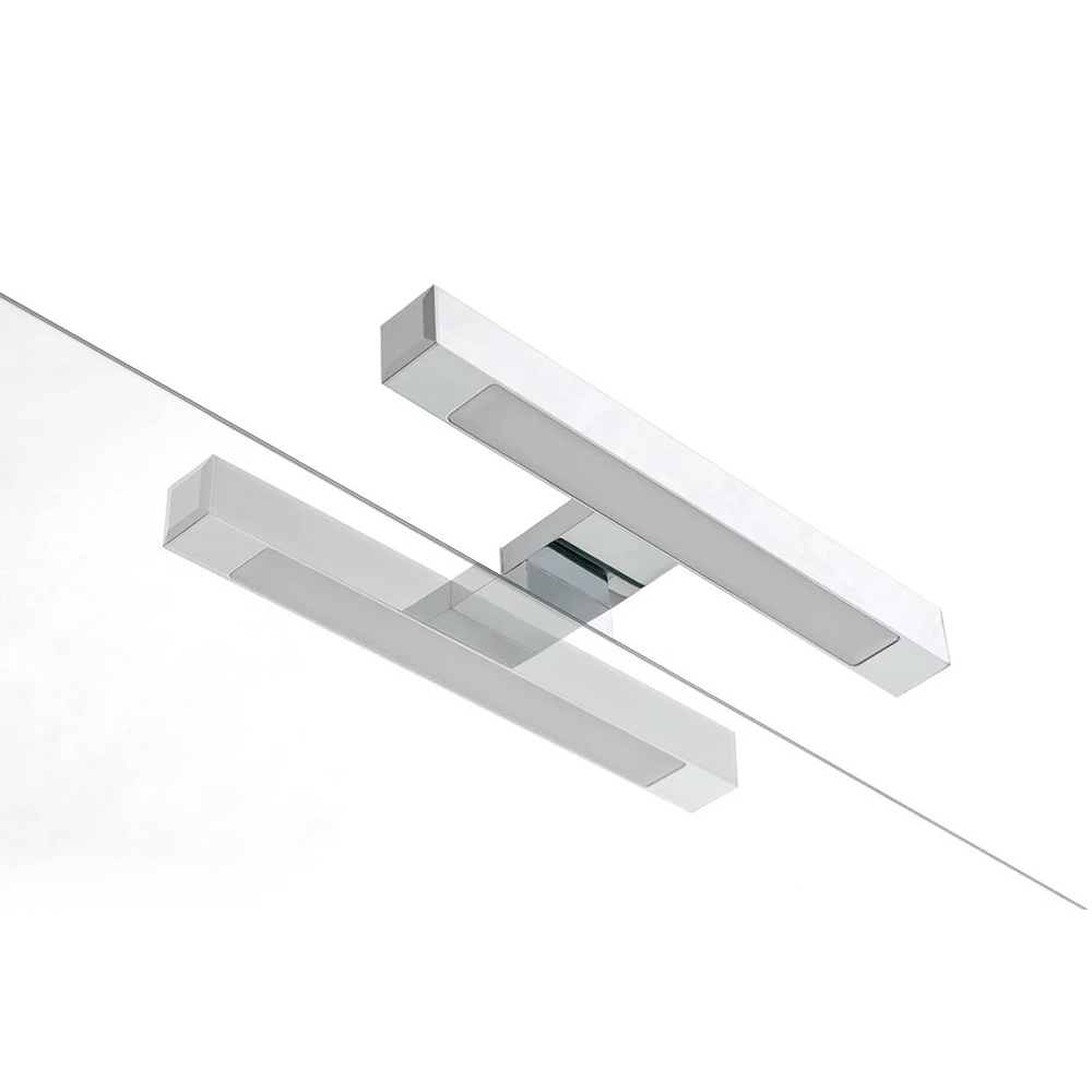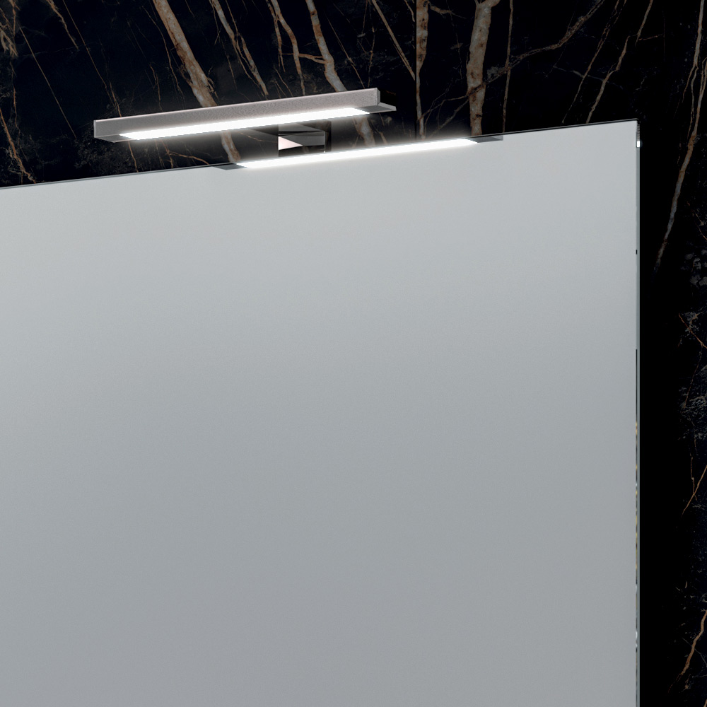 Der rechteckige Spiegel verstärkt die Helligkeit und verleiht dem Raum Tiefe, während die verchromten LED-Lampen für eine elegante und funktionale Beleuchtung sorgen, die den Waschbeckenbereich perfekt in Szene setzt.