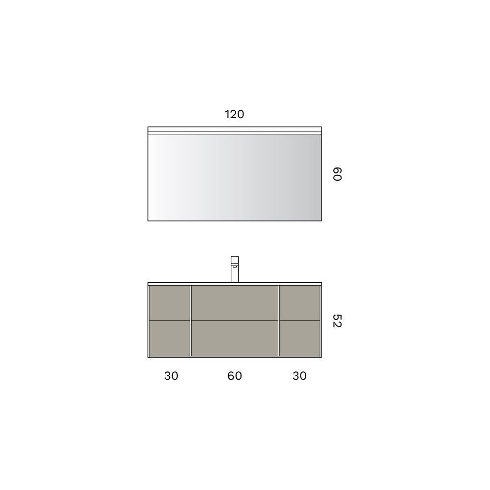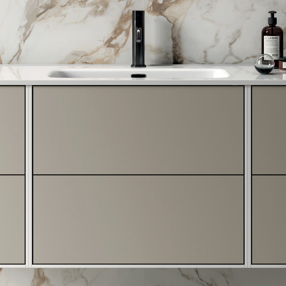 Eine moderne Badezimmergestaltung, die Eleganz und Funktionalität perfekt vereint. Die matte, taubengraue Oberfläche der Wandschränke schafft eine anspruchsvolle und zugleich entspannende Atmosphäre – ideal für moderne und stilvolle Räume.
