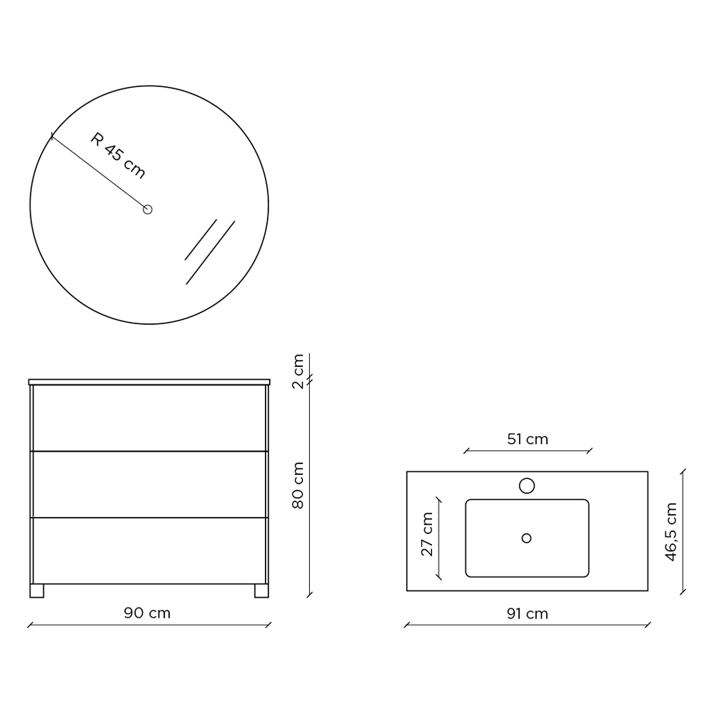Maße: Waschbecken: L 51cm x T 27cm Basis: L 90 cm x T 46,5 cm x H 82 cm Spiegel: R 45cm