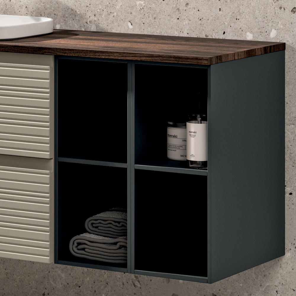 Ein moderner und designorientierter Vorschlag für Badezimmermöbel , ideal für alle, die eine umfassende, vielseitige Lösung mit starker ästhetischer Wirkung suchen, die jedes moderne Badezimmerambiente aufwertet.