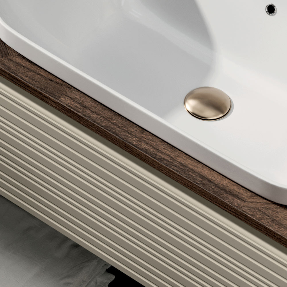 Das weiße Keramikwaschbecken mit seinen klaren und essentiellen Formen fügt sich dezent in die Arbeitsplatte ein und bietet Widerstandsfähigkeit, Pflegeleichtigkeit und eine zeitlose Ästhetik.