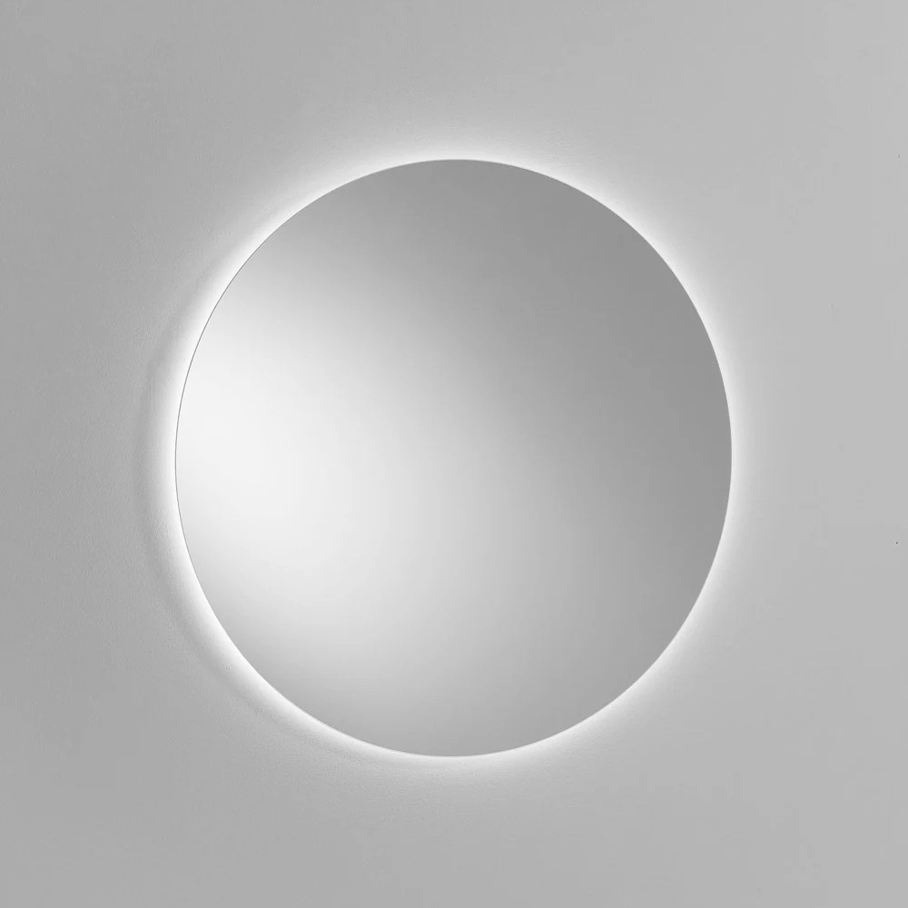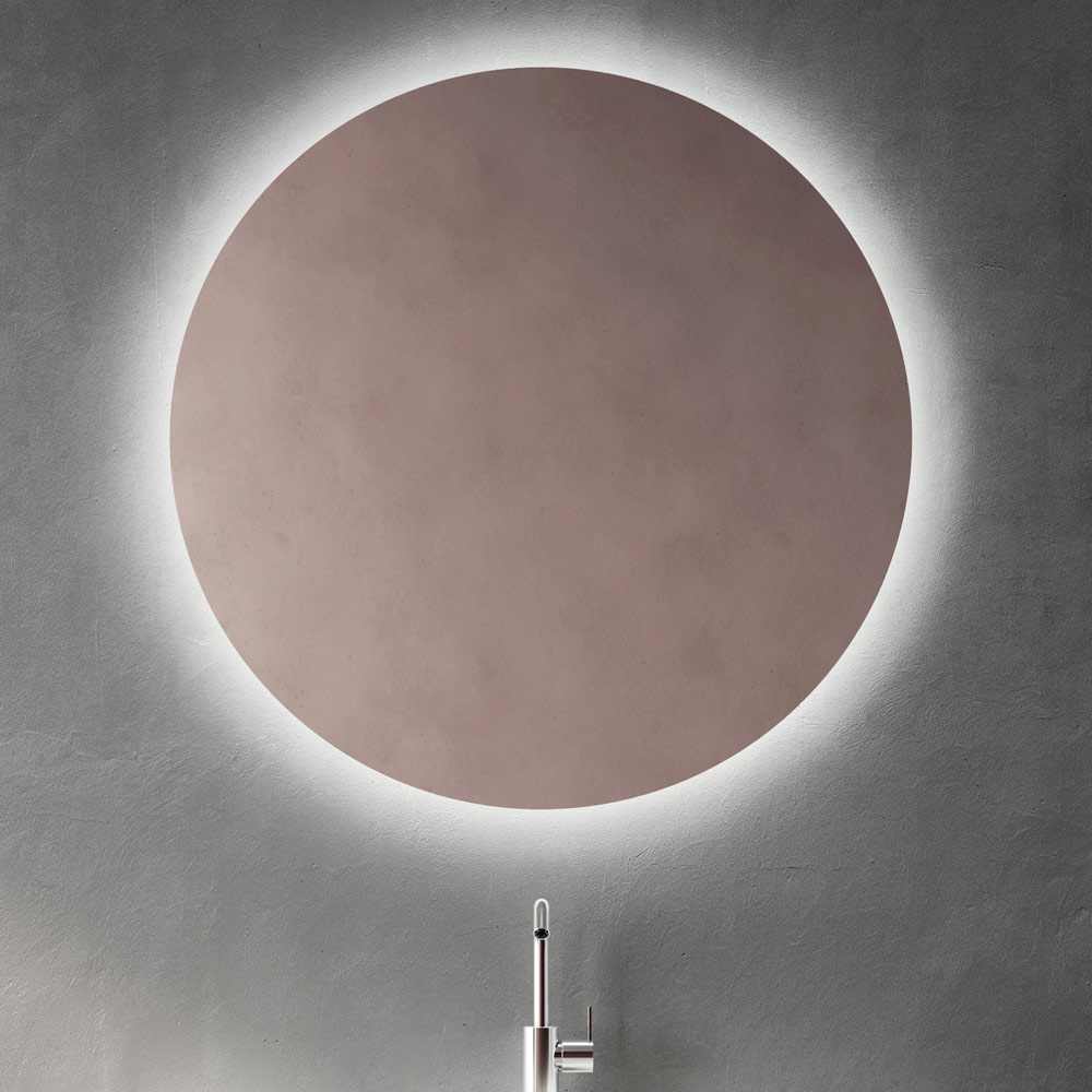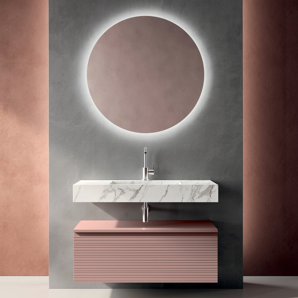 Der runde, LED-hinterleuchtete Spiegel steht im Mittelpunkt der Wand und bietet ein diffuses, einhüllendes Licht, das den Waschbeckenbereich aufwertet und zur Schaffung einer eleganten, eindrucksvollen Badezimmeratmosphäre beiträgt.