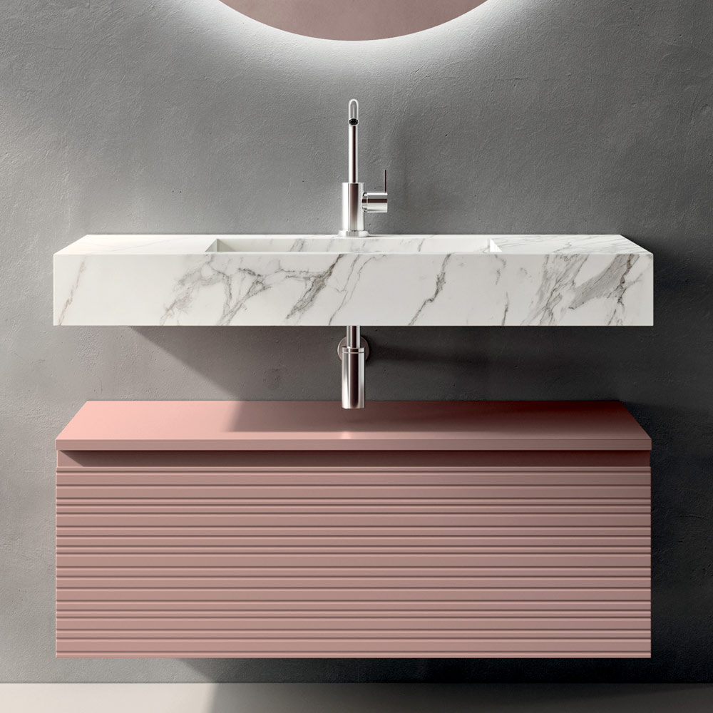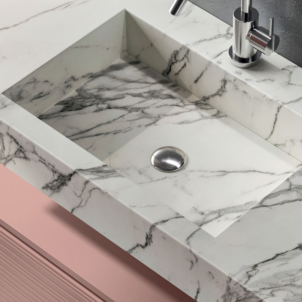 Die HPL-Waschtischplatte in Calacatta-Optik setzt einen Materialakzent mit großer optischer Wirkung: Die marmorähnliche Ästhetik verleiht Helligkeit und Wertigkeit und gewährleistet gleichzeitig hohe Leistungsfähigkeit in Bezug auf Widerstandsfähigkeit und Alltagstauglichkeit.