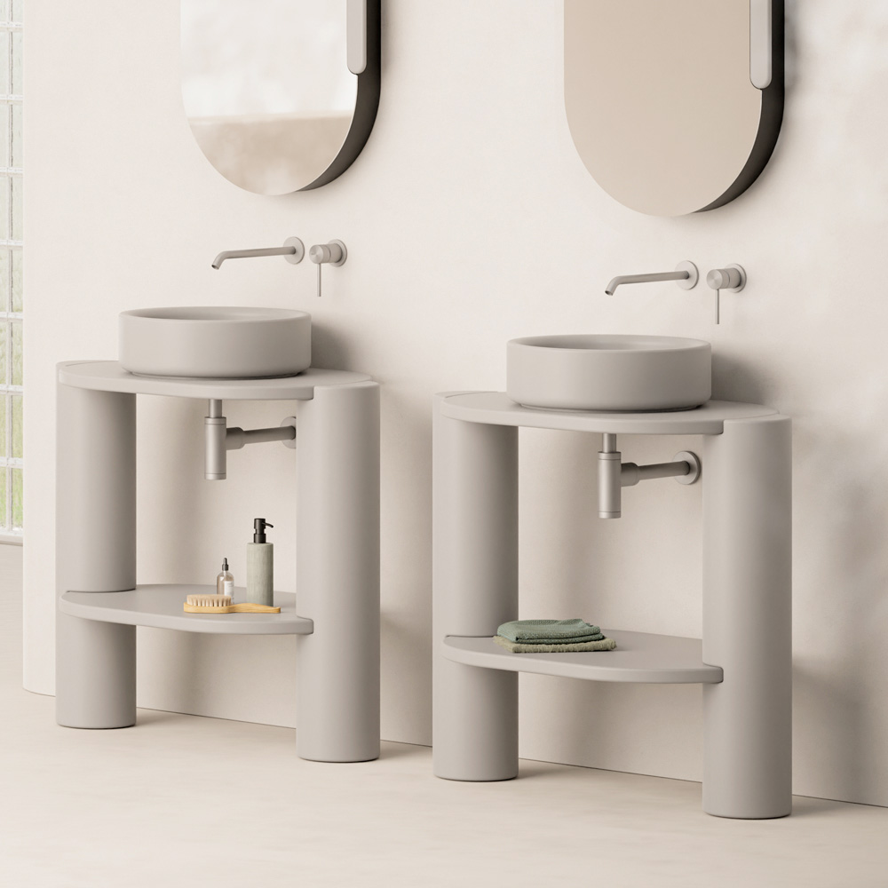 Ein Einrichtungsaccessoire, das moderne Linien und weiche Geometrien kombiniert und für alle gedacht ist, die ein elegantes, praktisches und außergewöhnliches Badezimmer suchen.