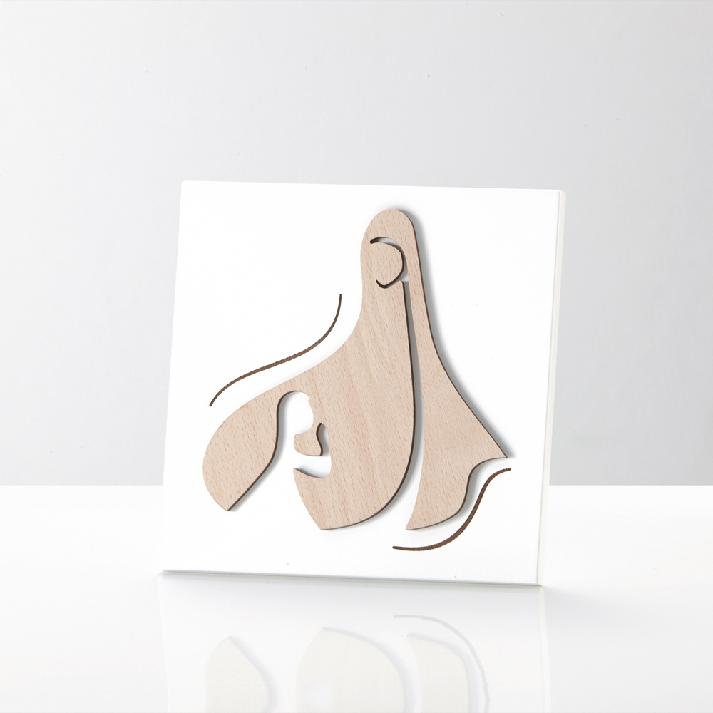Heiliges Bild mit der Darstellung der Erscheinung der Madonna aus Naturholz und Lasergravur. Weiß lackierte Holzplatte mit Stützfuß und Loch zum Aufhängen an der Wand.