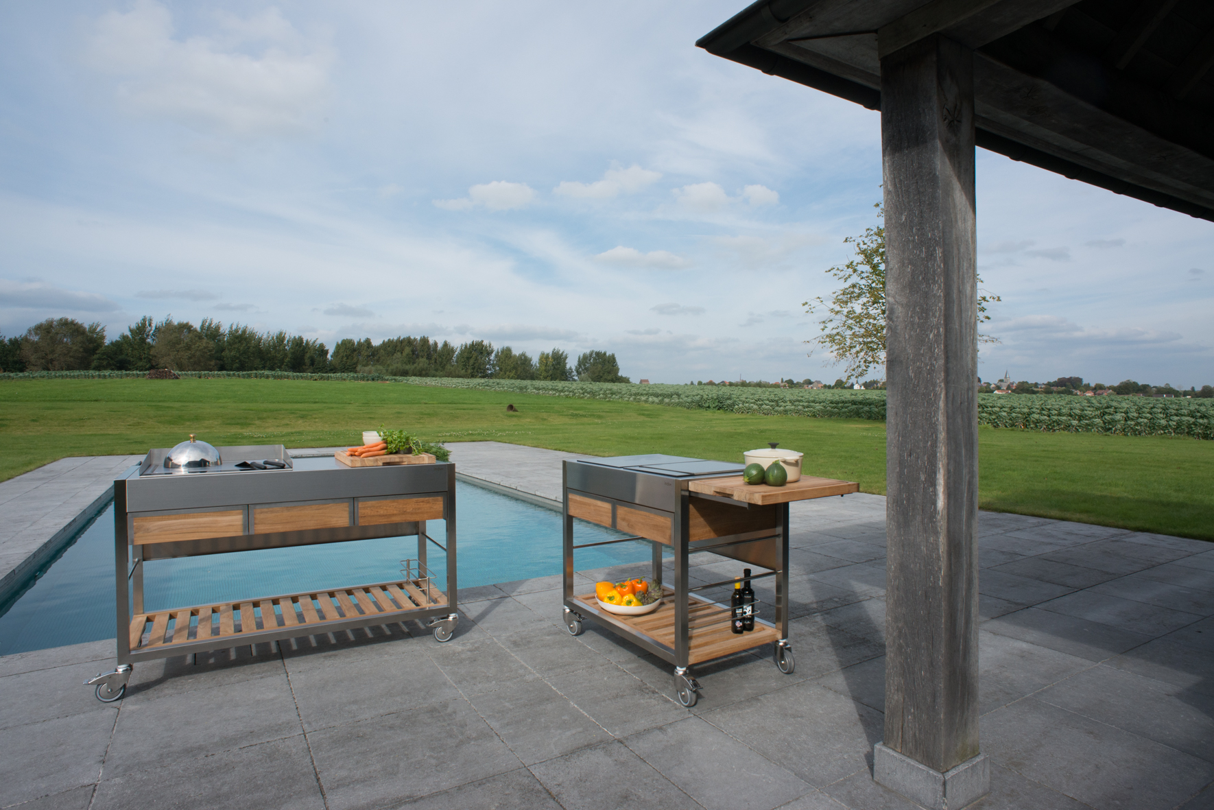 Eine originelle und funktionale Idee für alle, die gerne kochen und sich im Freien aufhalten, sind die Gartenküchen der Viadurini in der Garden-Kollektion. Funktionale Outdoor-Küchen, die dank der Räder leicht zu transportieren sind, bestehen aus Teakholz und gebürstetem Edelstahl.
