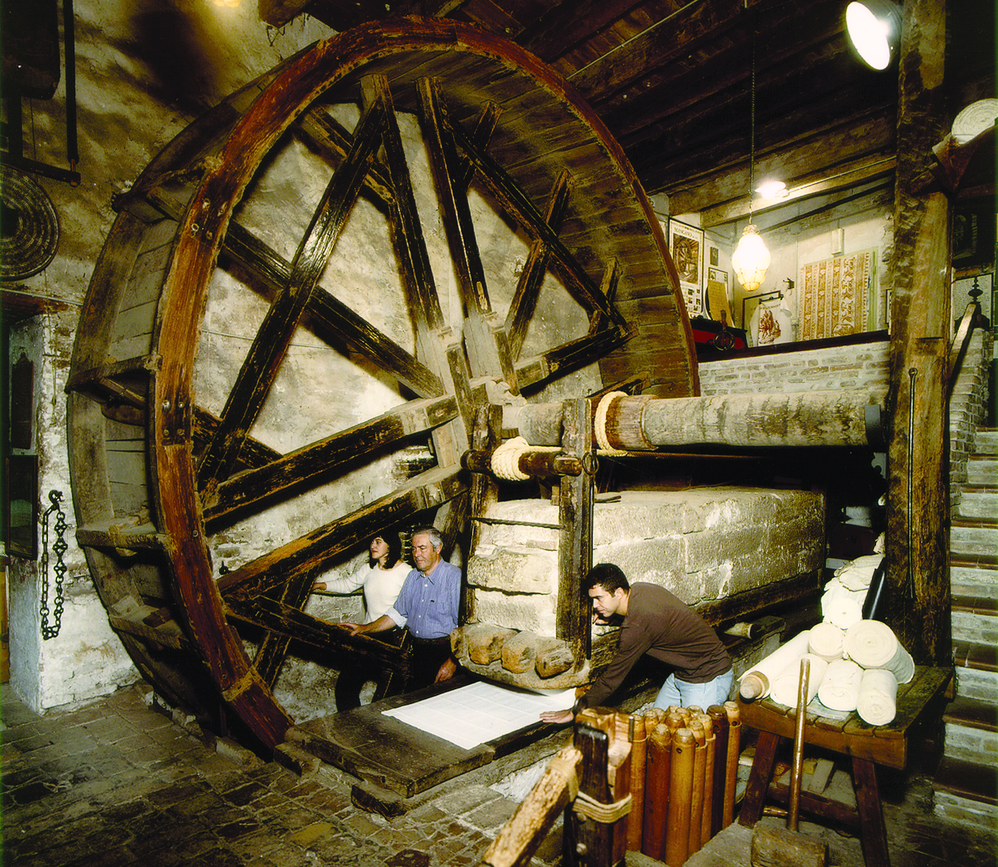 Sein Betrieb beruht auf dem Gleichgewicht zwischen dem Rad und dem Felsbrocken auf seiner Seite. Das Rad wirkt als Hebel und bewegt den Felsbrocken, der die wichtige Aufgabe hat, die Leinwand zu bügeln und zu verdichten. Beide wiegen 55 Zentner und dank dieses perfekten Verhältnisses bewegt sich die Mangel, wenn der Mann mit seinem eigenen Gewicht in das Lenkrad steigt, das Gleichgewicht. Die Leinwand ist um Holzrollen gewickelt, die als Balken bezeichnet werden. Die Rollen befinden sich unter dem Felsbrocken und folgen der Bewegung des Steins hin und her, wodurch das Bügeln ermöglicht wird. Es ist das einzige Gewicht des Menschen, das das Rad in Bewegung setzt, wodurch diese als Füllung bezeichnete Operation erleichtert wird.Noch heute, vor dem Drucken der Leinwand und nach dem Drucken, fahren wir mit dieser Drehung des Rads fort, um die Stoffe zu verschönern und ein hervorragendes Ergebnis zu erzielen.