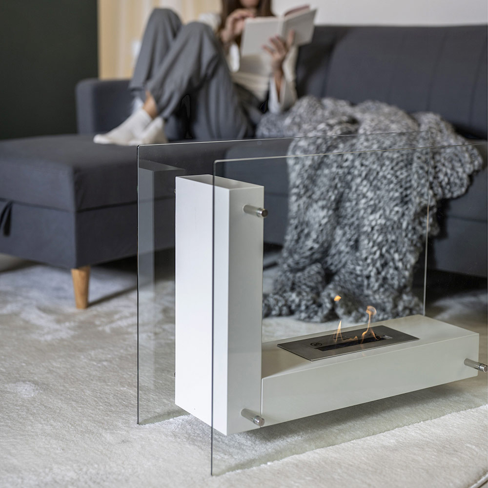 Boden-Biokamin für den Innen- oder Außenbereich aus weiß lackiertem Metall und transparentem gehärtetem Glas, das die Flamme vor Windböen schützt und sie hervorhebt. Komplett mit Flammenkontrollwerkzeug und Bedienungsanleitung. Ein elegantes und funktionales Einrichtungsaccessoire, ideal zum Heizen von Wohn- und Objektumgebungen im Innen- und Außenbereich. Sein minimalistischer und raffinierter Stil macht ihn auch im ausgeschalteten Zustand spürbar, da es den umgebenden Raum durch eine Hauch von Persönlichkeit und Raffinesse .