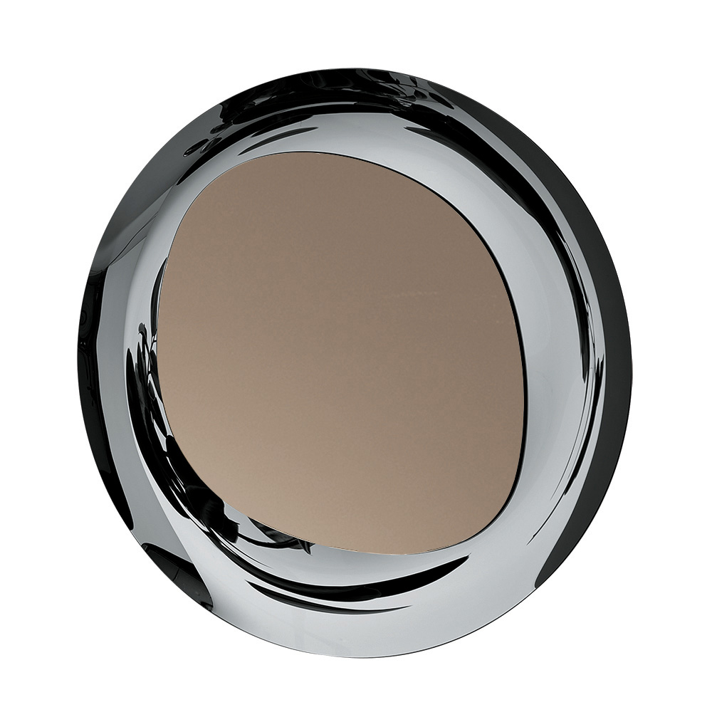 Der Spiegel besteht aus einer geformten, bronzefarbenen Platte, die auf einem runden Rahmen aus Rauchglas ruht. Das Zusammenspiel der Oberflächen und unterschiedlichen Volumen erzeugt ein elegantes Wechselspiel von Form- und Materialkontrasten und ergibt so ein anspruchsvolles und zeitloses Objekt, das jede Wand verschönert.