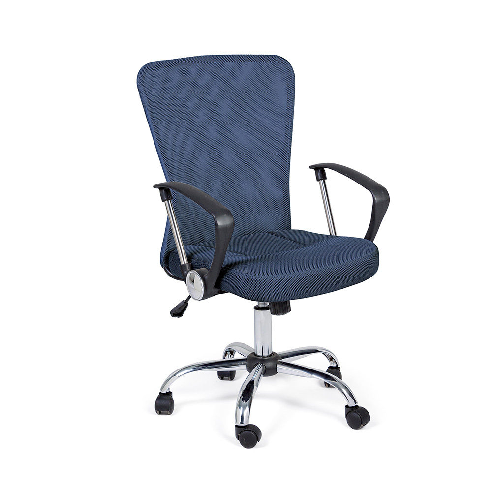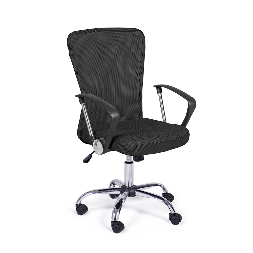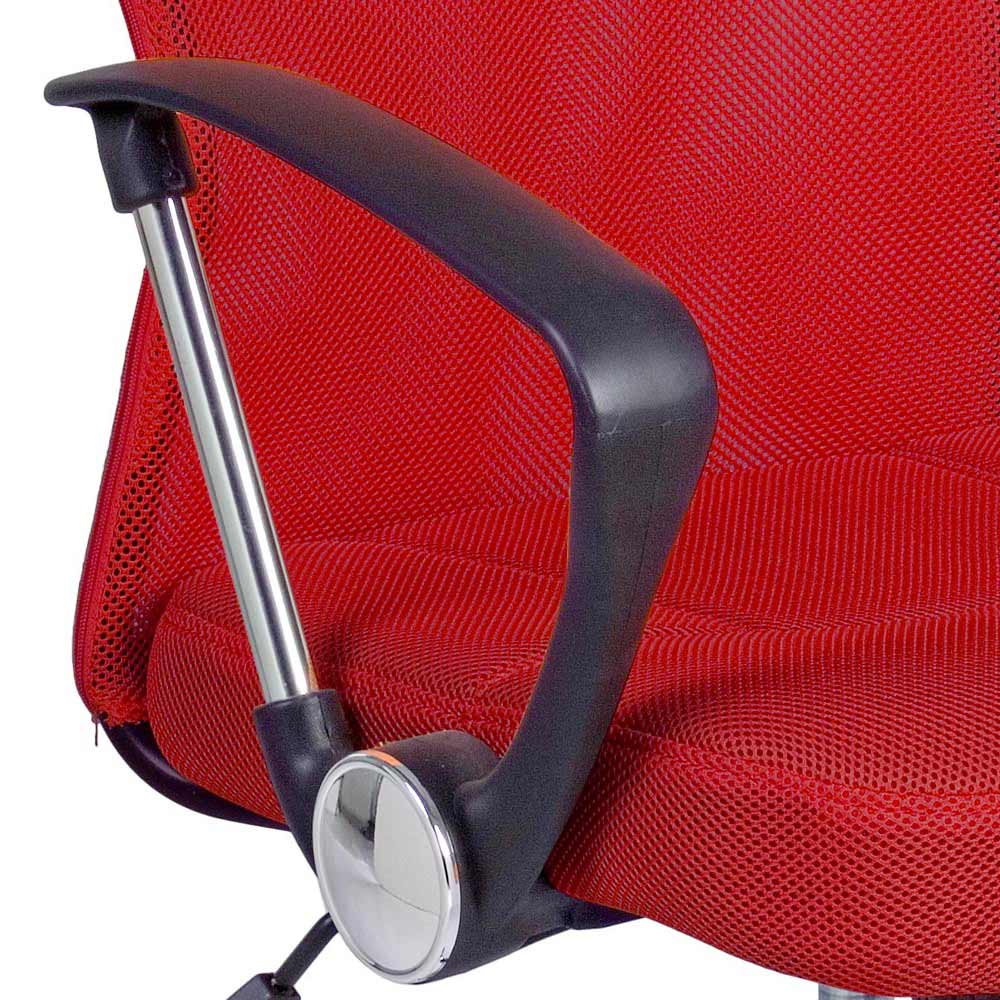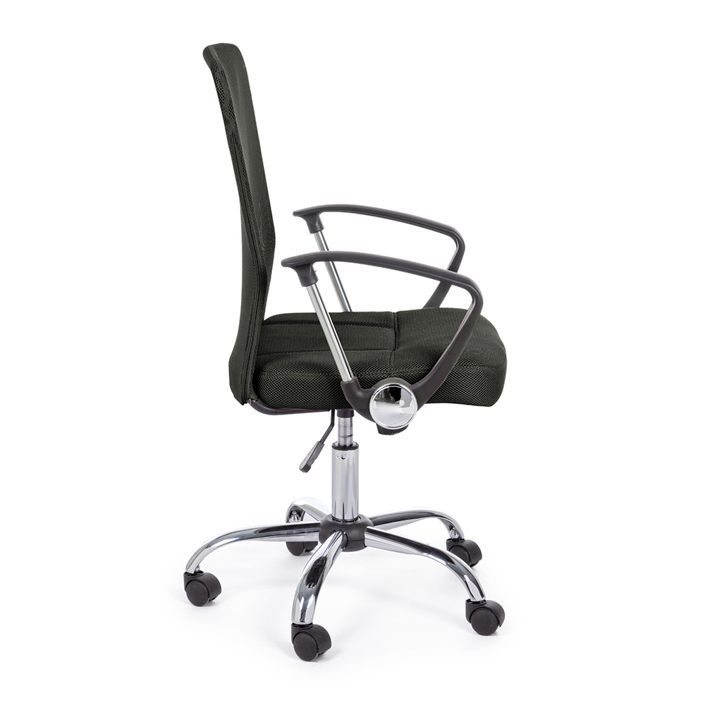 Der höhenverstellbare gepolsterte Sitz und die Rückenlehne sind mit 100 % Polyester- Netzgewebe mit Kunststoffarmlehnen bezogen.