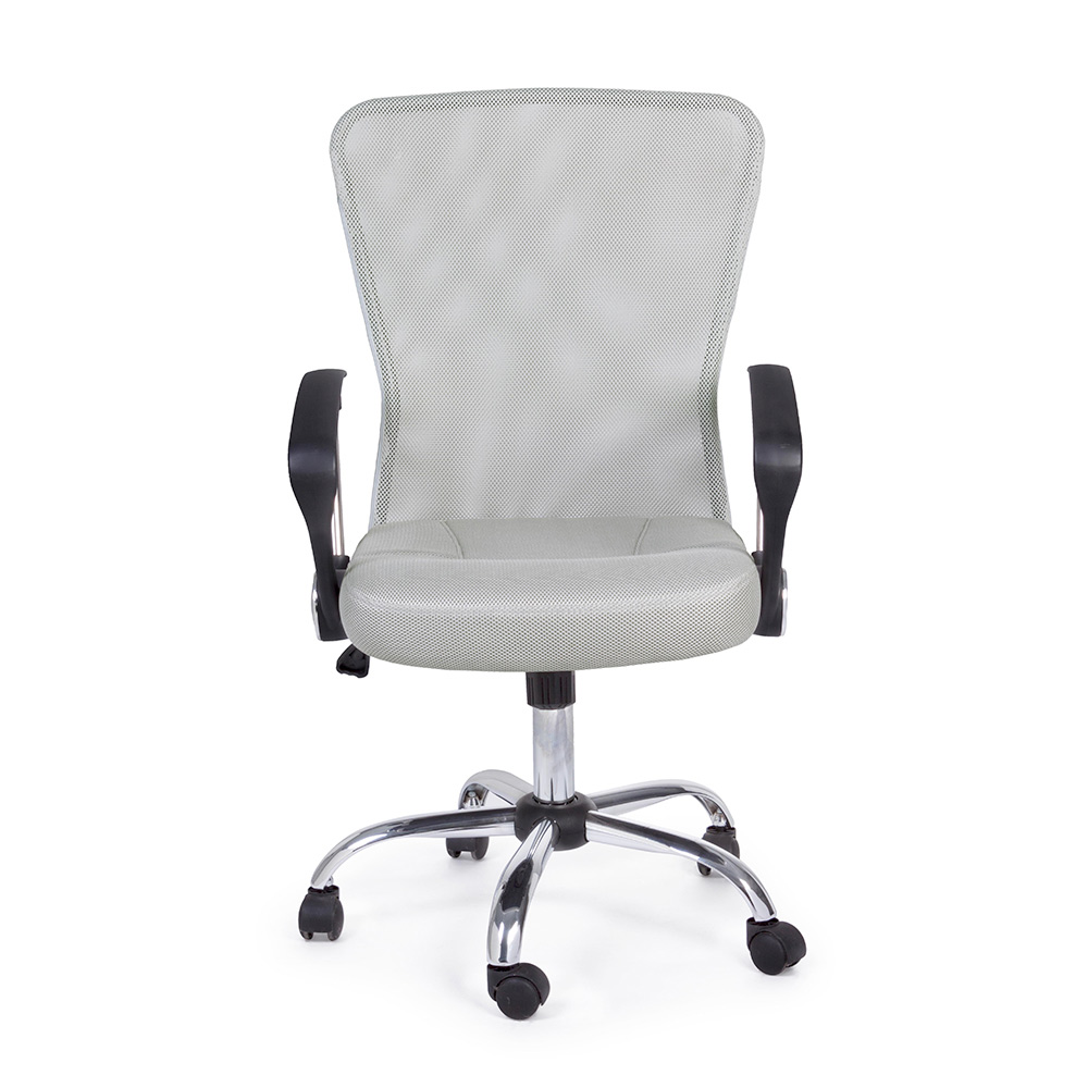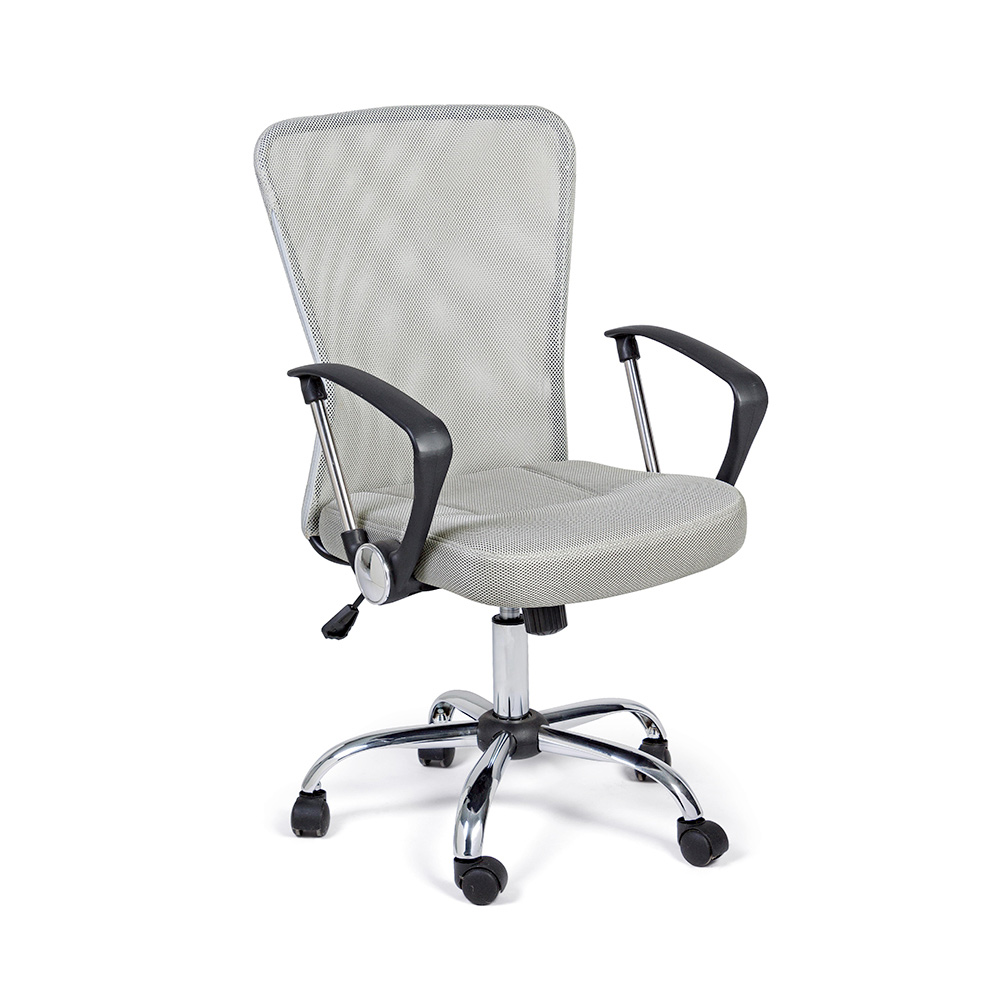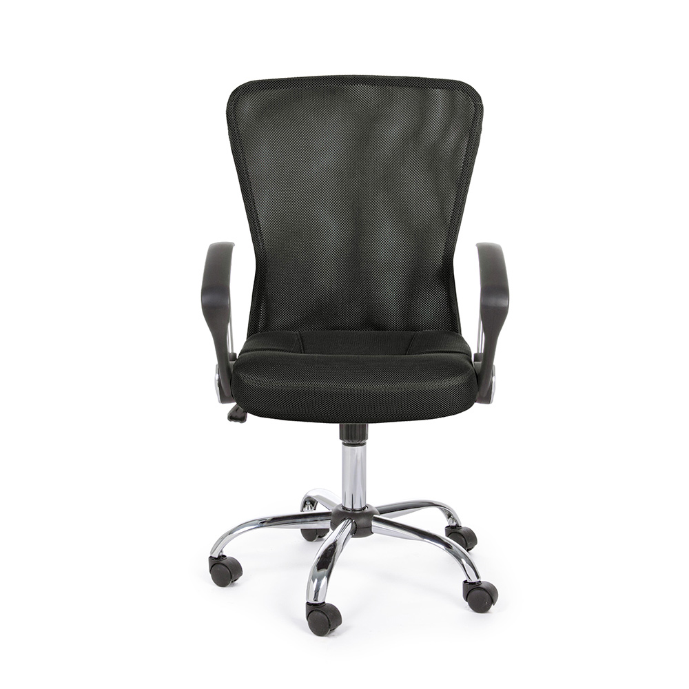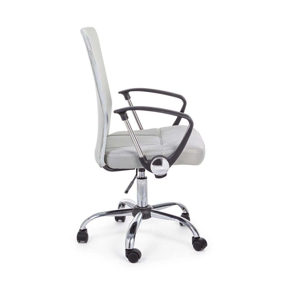 Der höhenverstellbare gepolsterte Sitz und die Rückenlehne sind mit 100 % Polyester- Netzgewebe mit Kunststoffarmlehnen bezogen.