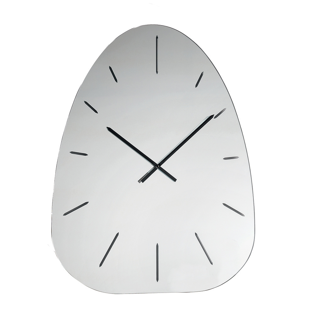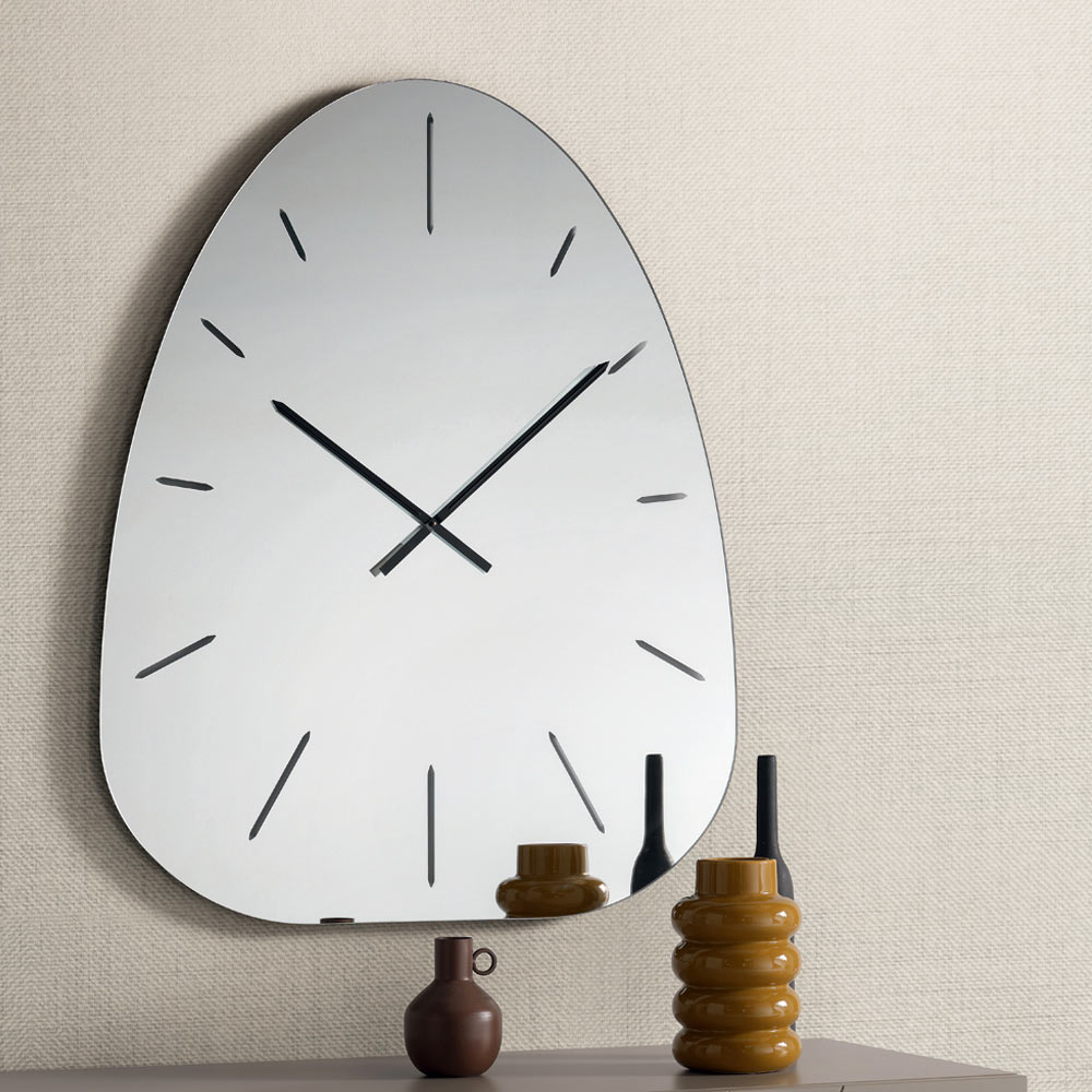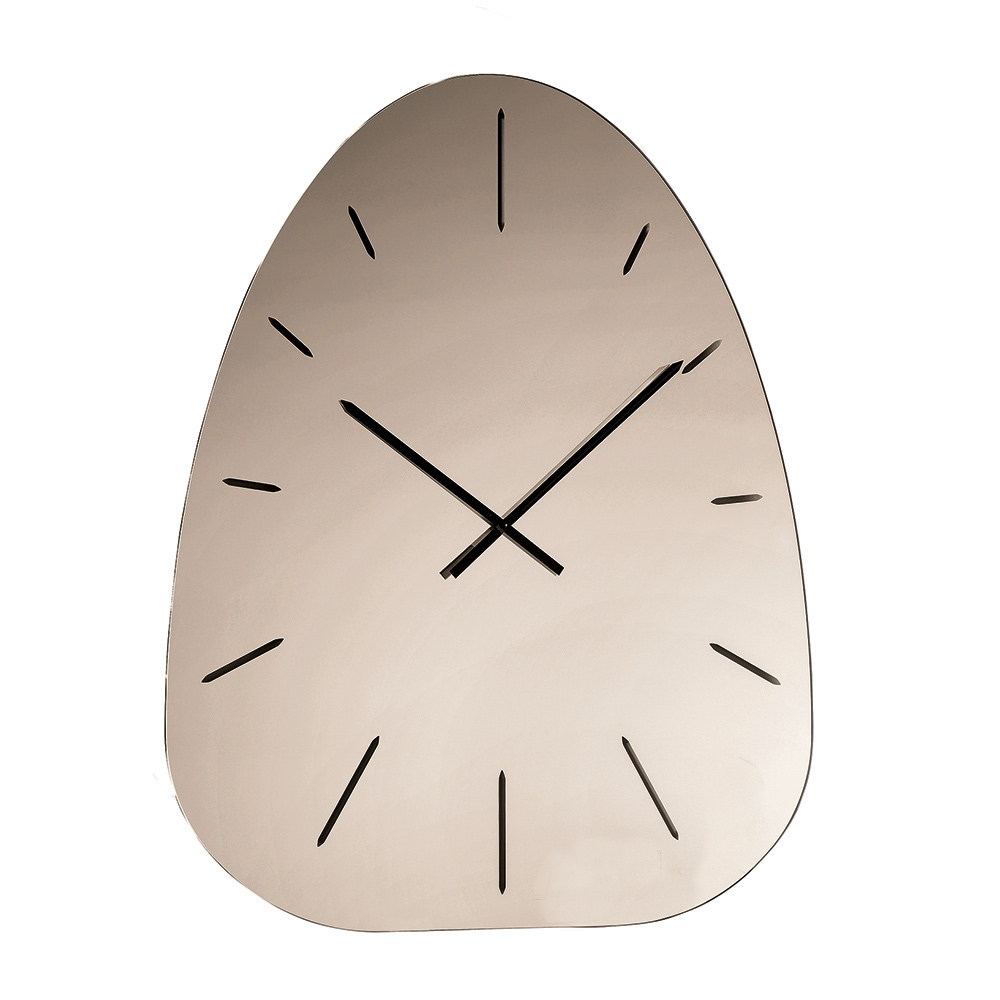 Die aus Spiegelglas gefertigte Uhr besticht durch ihre lasergravierten Ziffern , die dezent aus der reflektierenden Oberfläche hervortreten und ein raffiniertes Spiel von Licht und Tiefe erzeugen, das sich im Laufe des Tages verändert.